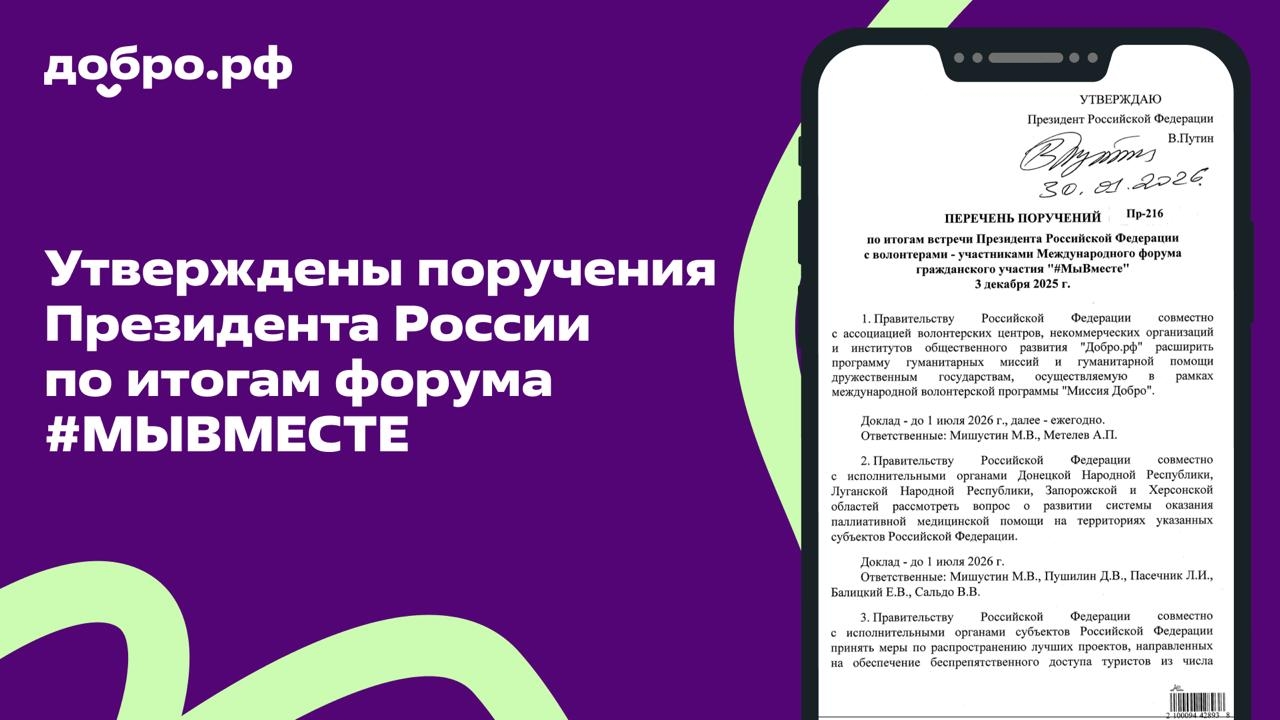⚡️ Утверждены поручения Владимира Путина по итогам встречи с волонтёрами на Международном форуме #МЫВМЕСТЕ