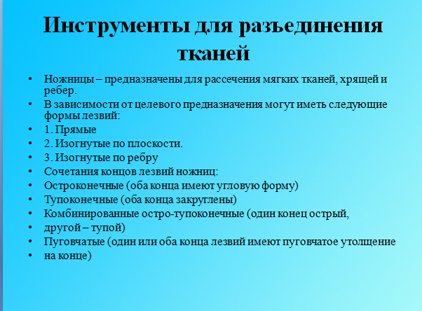 Любая операция состоит из трёх компонентов: разъединение тканей, остановка кровотечения и моединение тканей. Для выполненич каждого хирургического действия нужны соответствующие инструменты, являющиеся непосредственным продолжением руки хирурга. Необходимость хорошего владения соответствующими инструментами очевидна. Однаков, нужно всегда помнить, что, по образному выражению немецкого хирурга Г.Фишера, вооруженная инструментом "рука хирурга не более, чем орудие его ума".