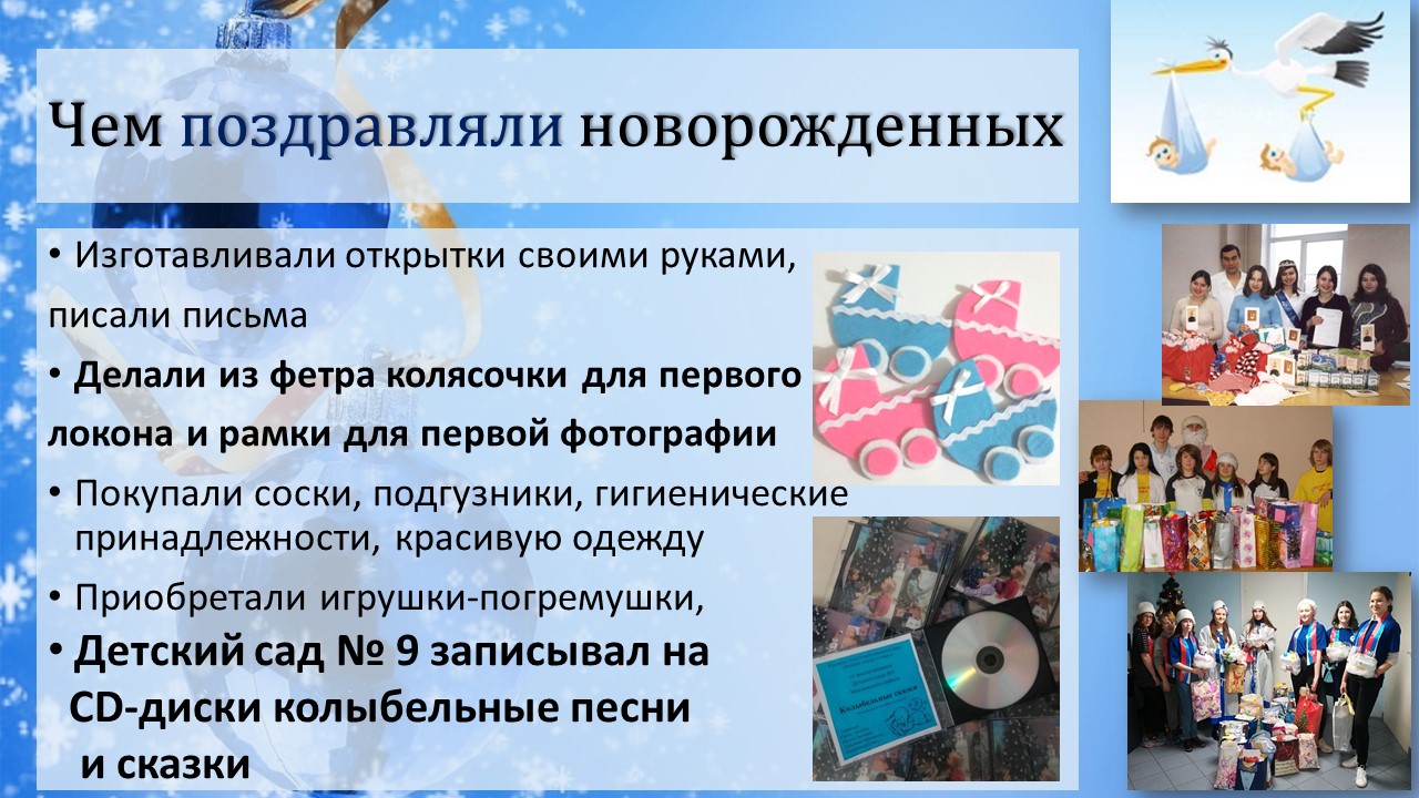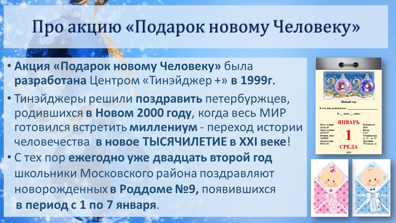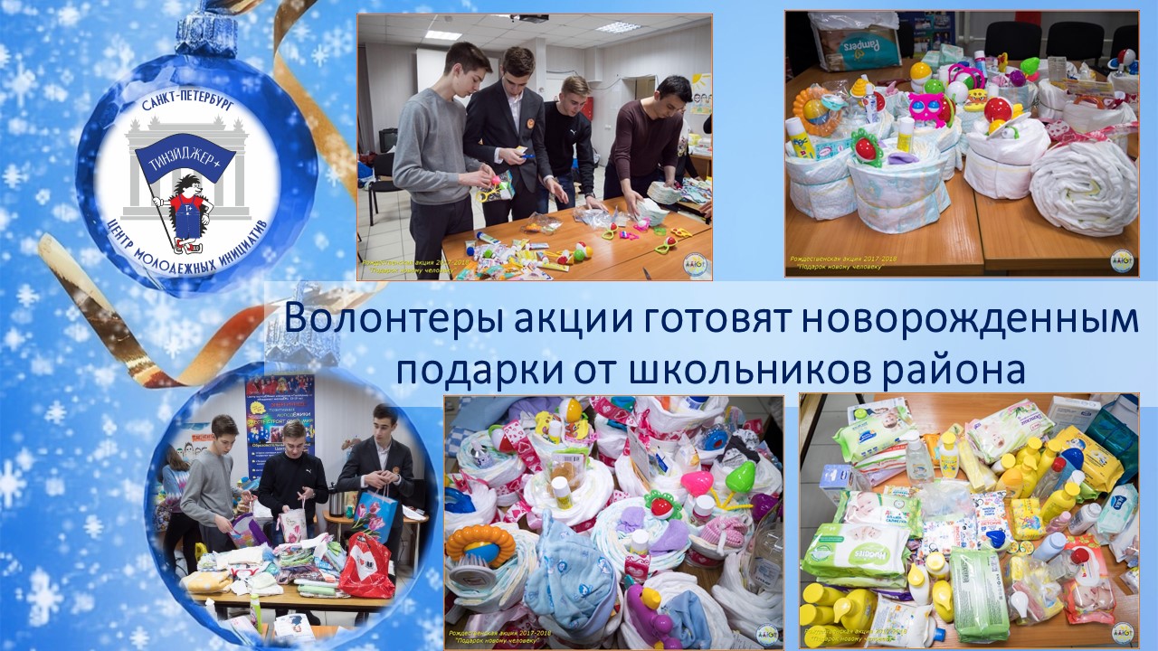 Каждый год (уже двадцать второй год) волонтеры детско-юношеской общественной организации "Тинэйджер+" проводят новогодне-рождественнскую акцию "Подарок новому Человеку". Юные активисты приходят в Роддом №9 Санкт-Петербурга поздравлять новорожденных, появившихся 1 января (в Новый год) и 7 января (в Рождество).