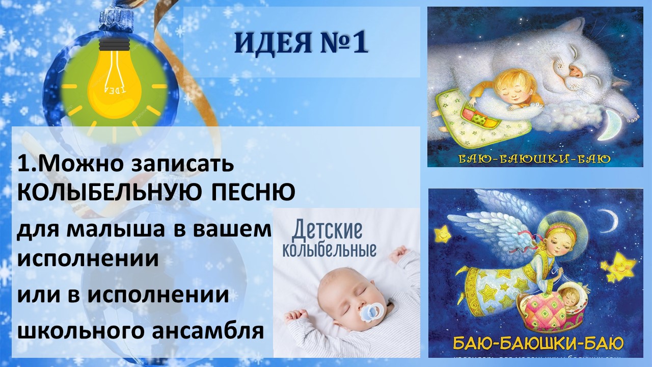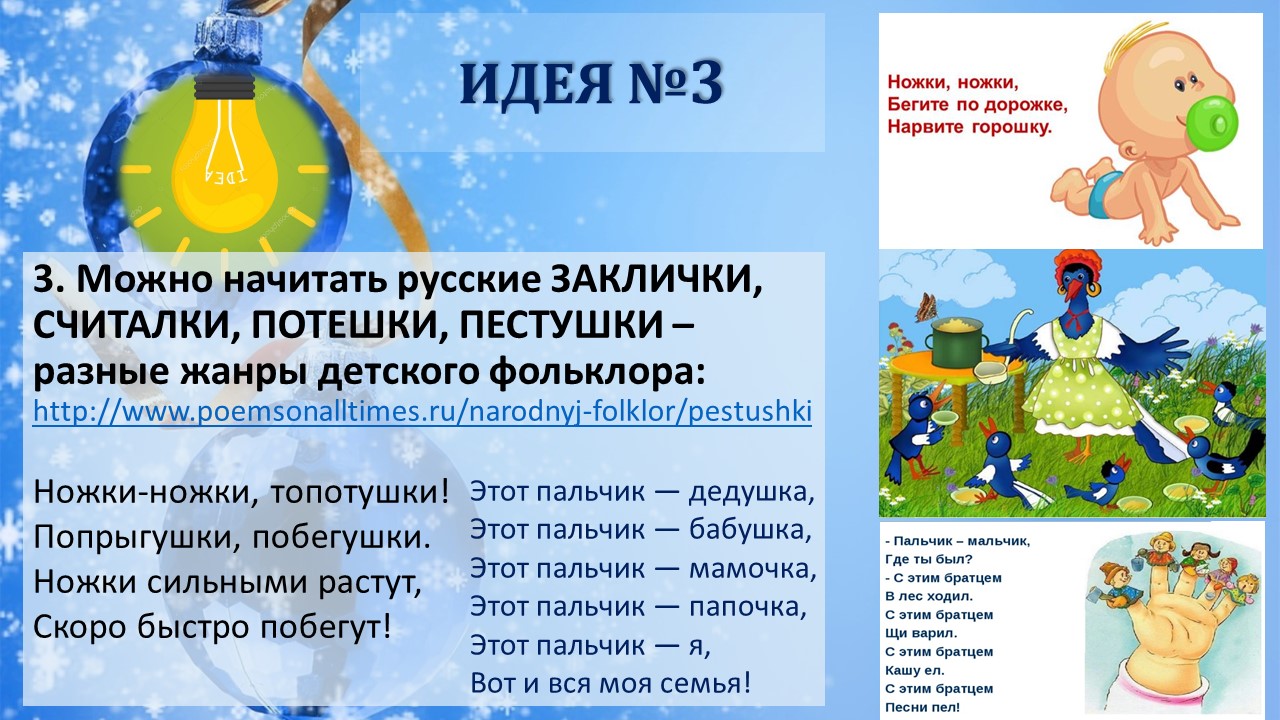 1. аудиозапись колыбельных песен, русских народных считалок, пестушек, потешек и стишков для знакомства ребенка с Миром через мудрость фольклора;