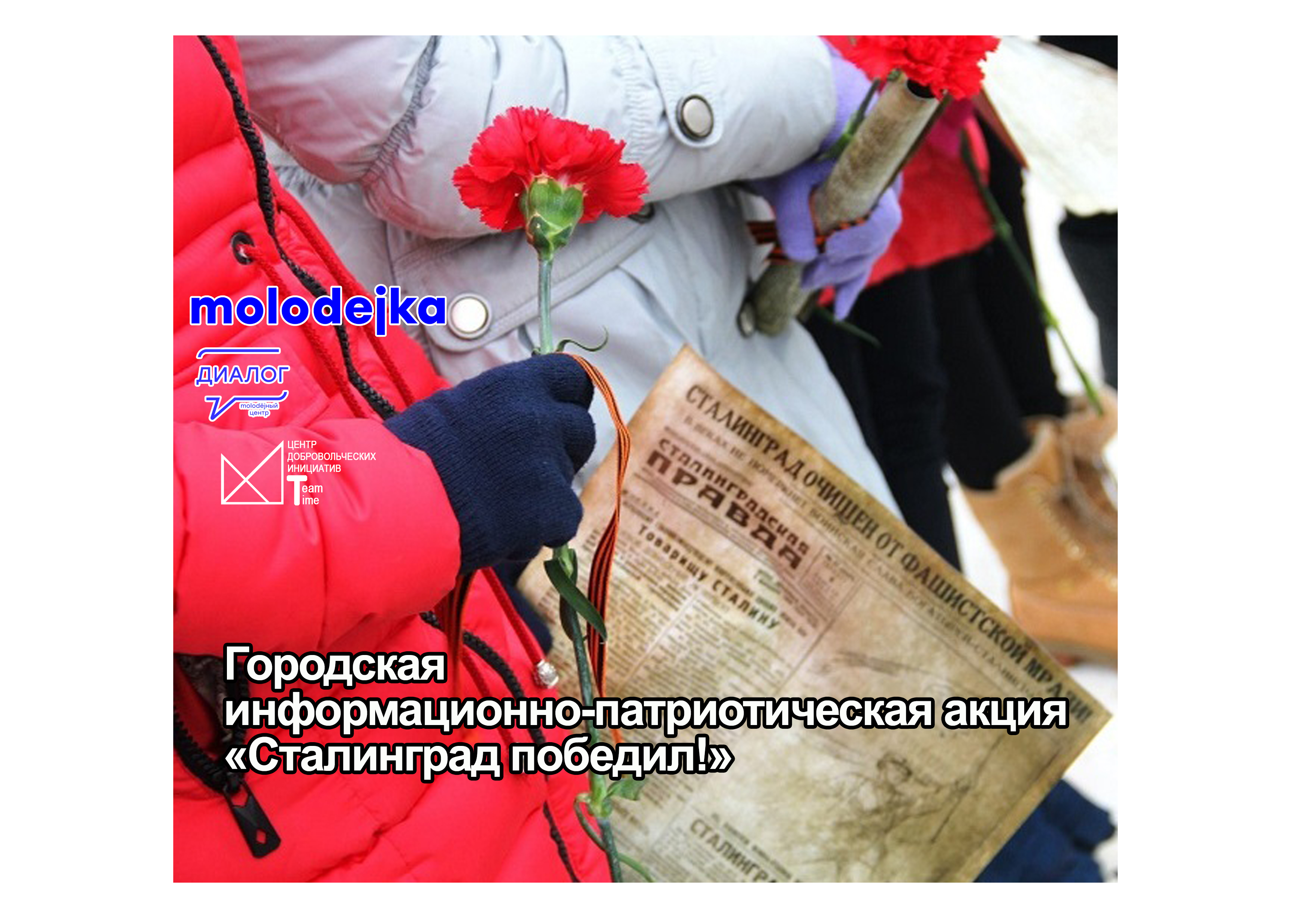 Городская информационно-патриотическая акция «Сталинград победил!» состоится 1 и 2 февраля во всех районах города. Волонтеры и воспитанники муниципальных молодежных центров и клубов раздадут волгоградцам 9000 копий легендарного выпуска газеты.Победный выпуск газеты «Сталинградская правда» вышел 4 февраля 1943 года. Он оповестил читателей о разгроме немецко-фашистской группировки войск на берегах Волги. На первой полосе было опубликовано донесение штаба Донского фронта за подписью генерал-полковника Константина Рокоссовского, в котором говорилось, что в связи с полной ликвидацией окруженных войск противника, боевые действия в Сталинграде прекратились.В Тракторозаводском районе акцию проводит Центр добровоьческих инициатив "Team Time" МУ "Молодежно-подростковый центр Тракторозаводского района Волгограда" с ЗАРАНЕЕ подготовленными волонтёрами!