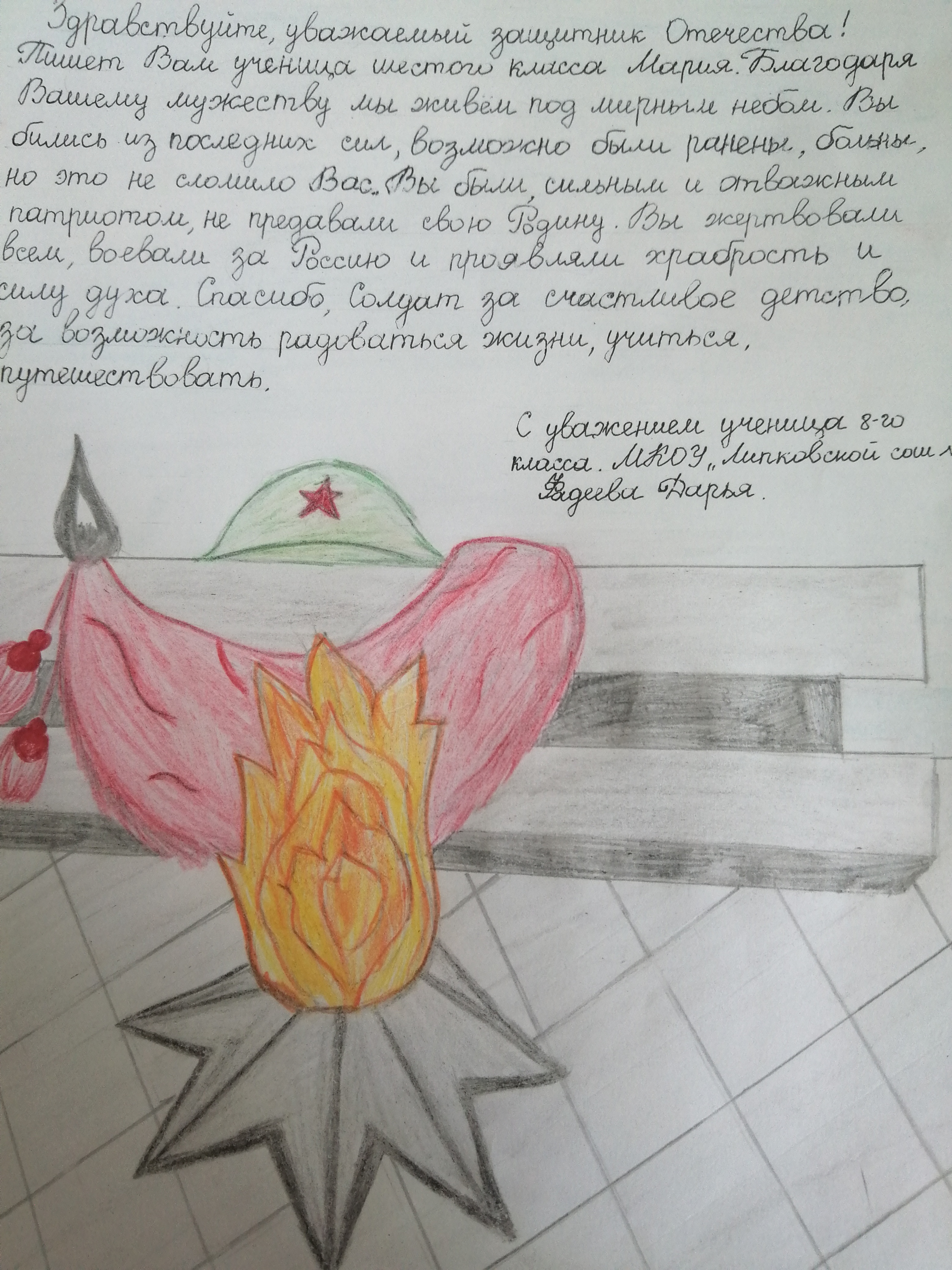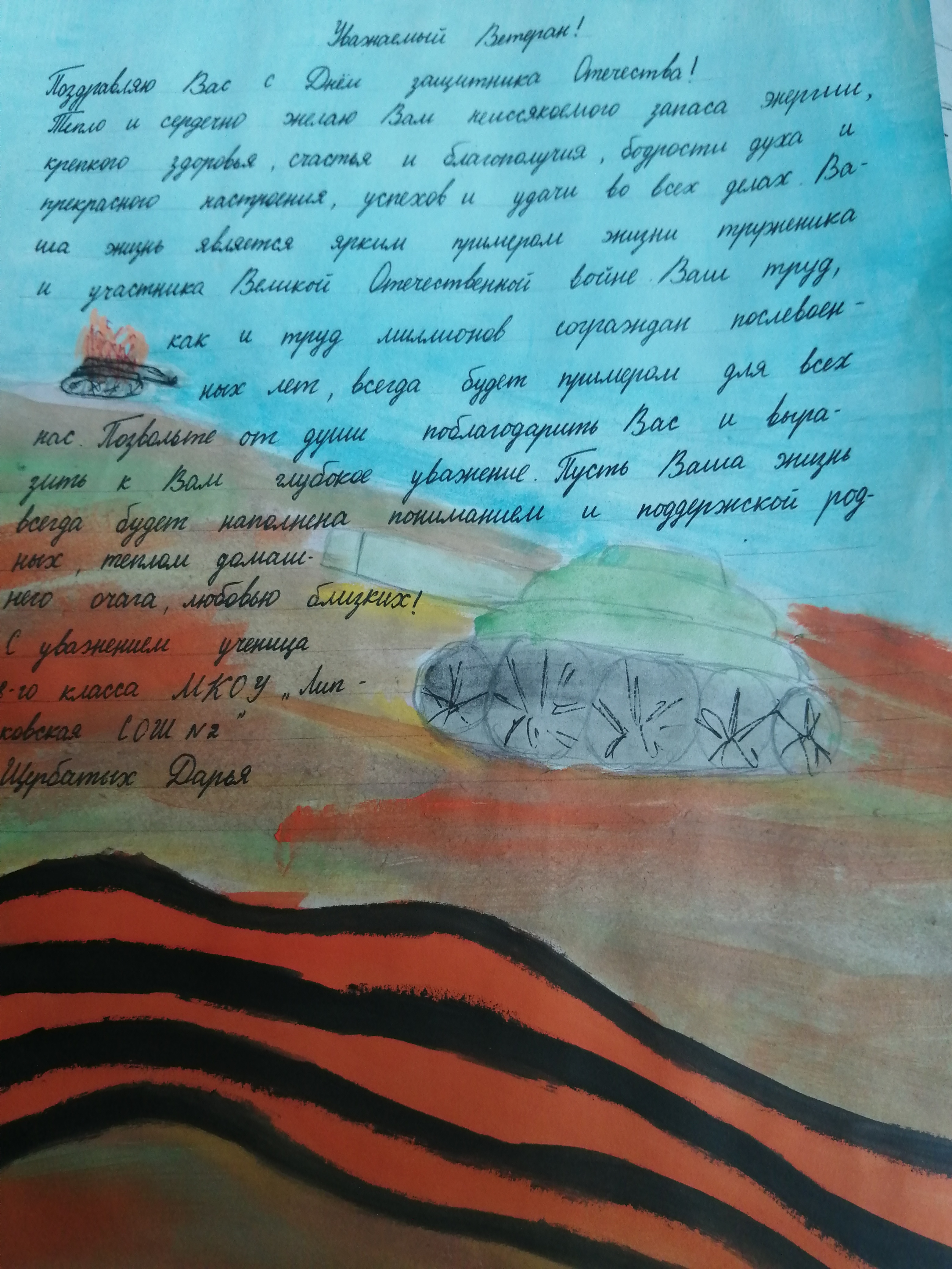 Участникам акции необходимо написать письма защитникам Отечества (ветеранам ВОв, воинам-интернационалистам, участникам боевых действий в горячих точках). в письме выражается благодарность, пожелания и размышления детей, учеников в адрес защитников Отечества. в канун празднования Дня защитника Отечества письма передаются адресатам по почтовому адресу.