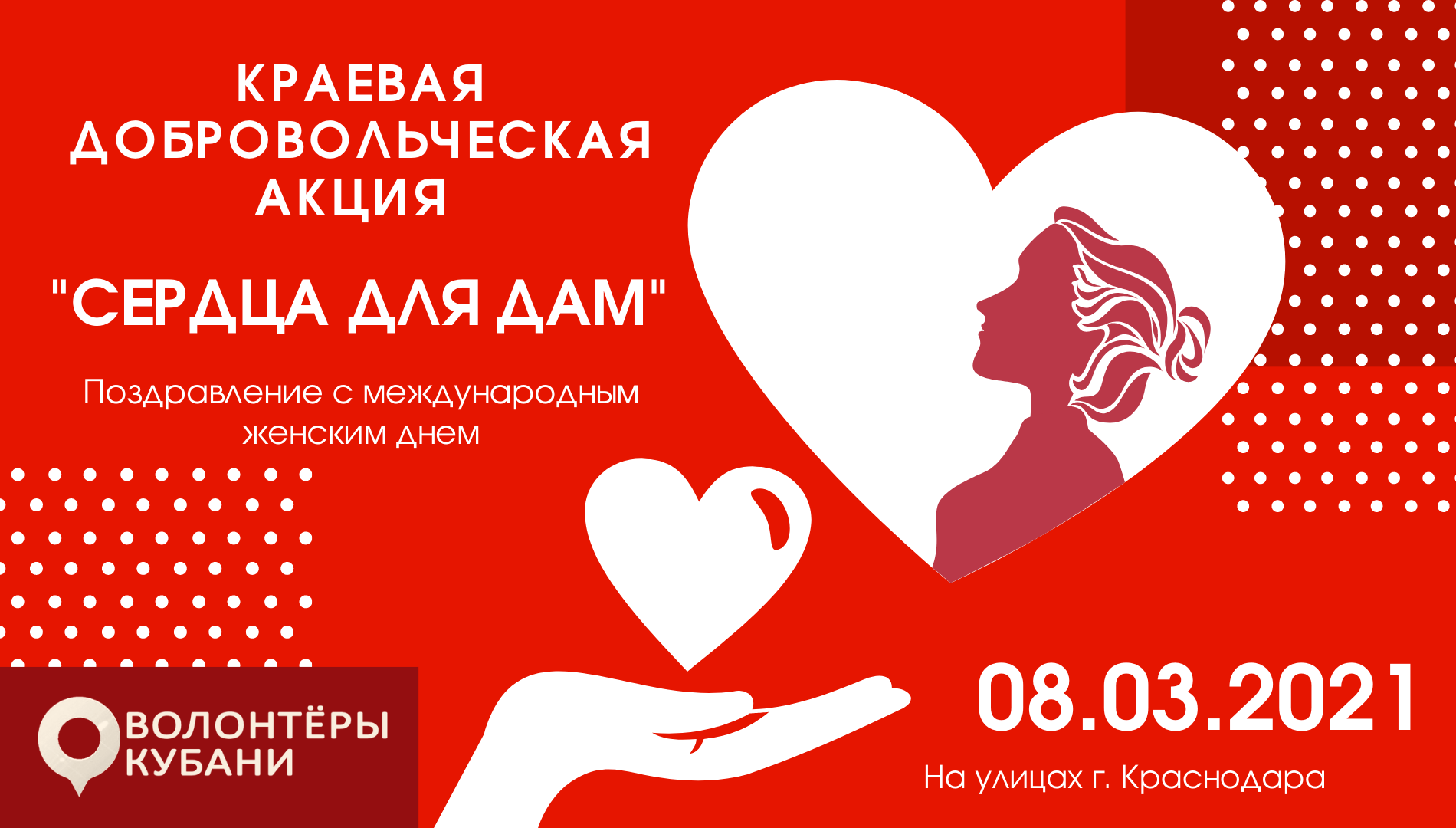 В рамках празднования Международного женского дня 8 марта 2021 г. будет проведена Краевая благотворительная акция "Сердца для дам". В рамках мероприятия добровольцы РОД "ВОЛОНТЕРЫ КУБАНИ" проведут викторину о праздник и поздравят женщин в общественных местах, на улицах города, подарят им приятные сюрпризы сделанные своими руками.