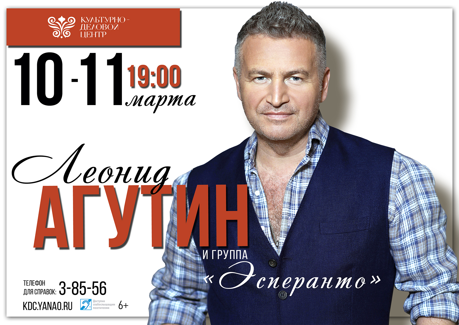 10 и 11 марта в 19:00 часов для зрителей Культурно-делового центра пройдет концерт Заслуженного артиста Российской Федерации Леонида Агутина и группы «Эсперанто».