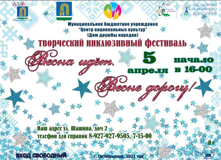 В Центре национальных культур состоится творческий инклюзивный фестиваль "Весна идет, весне дорогу" для лиц с ограниченными возможностями здоровья.