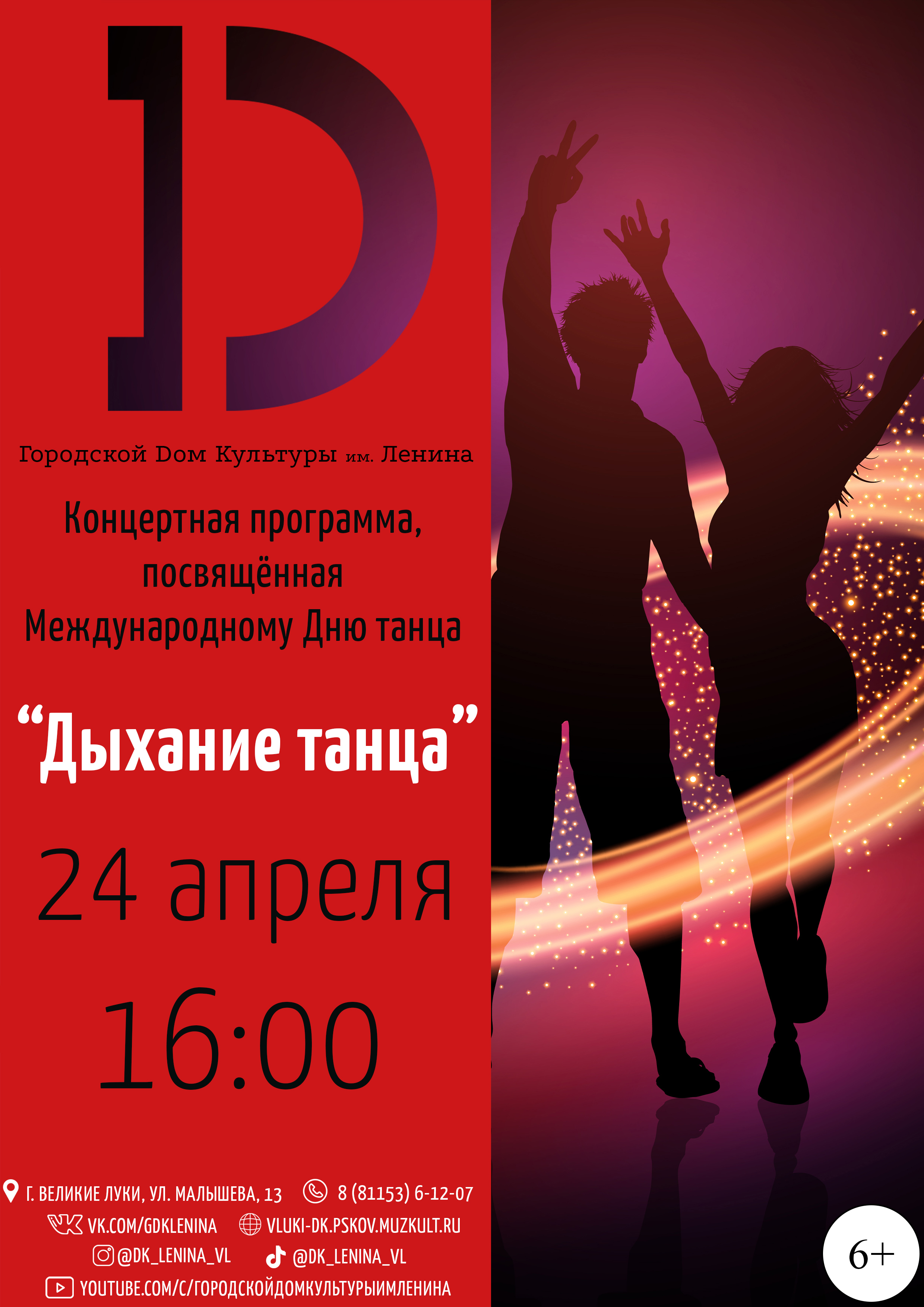 Концертная программа, посвященная Международному Дню танца "Дыхание танца". В программе примут участие творческие коллективы города Великие Луки.