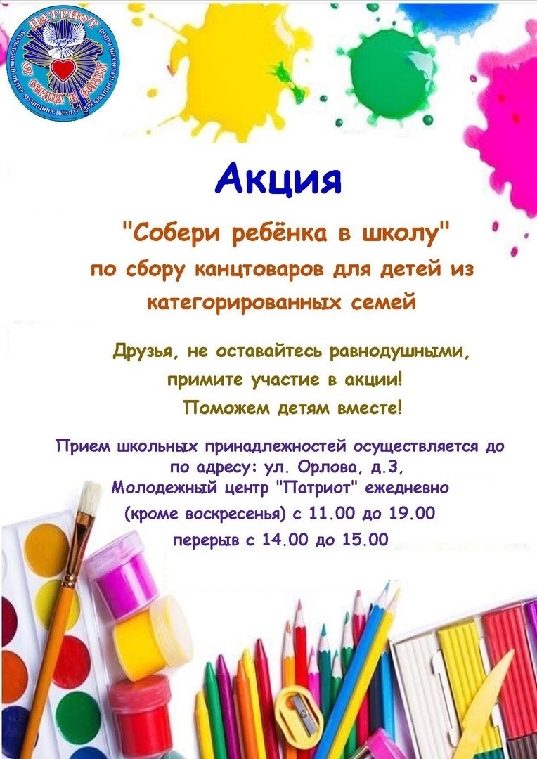 Прием школьных принадлежностей осуществляется по адресу: ул. Орлова, д.3, Молодежный центр "Патриот" ежедневно (кроме воскресенья) с 11.00 до 19.00 (перерыв с 14.00 до 15.00)