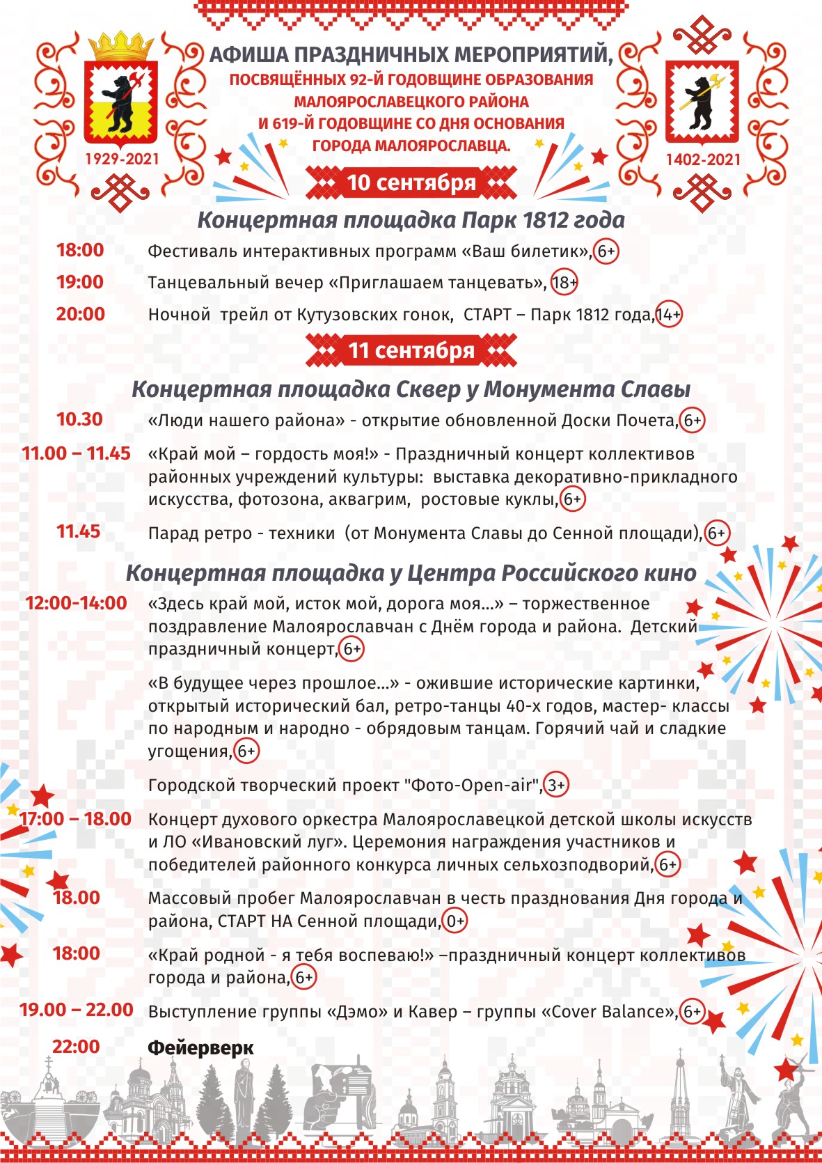 11 сентября 2021 года в городе Малоярославец будет проходить мероприятие посвященное празднованию 619 –летия города воинской славы – Малоярославец и 92– летия Малоярославецкого района.