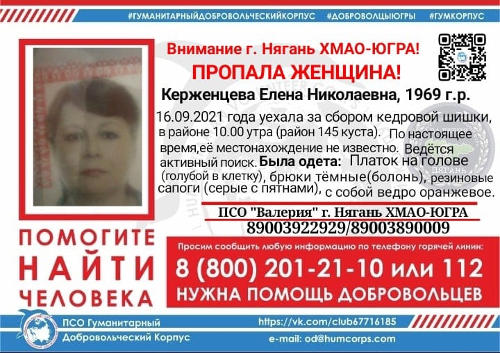 16 сентября 2021 года ушла в лес за шишками и не вернулась, ведется активный поиск, до сих пор место нахождение Елены Николаевны не известно.