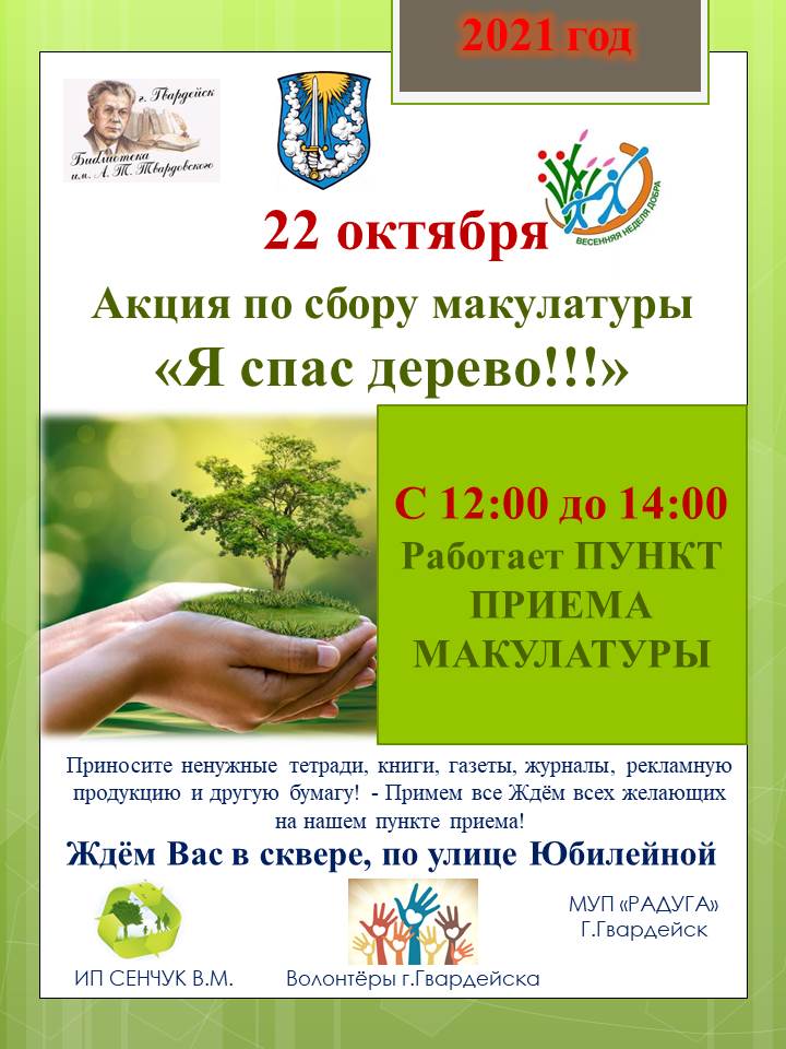 Акция по сбору макулатуры для жителей Гвардейского городского округа. Волонтеры "серебряного" возраста и волонтеры культуры будут помогать принимать макулатуру, взвешивать и передавать переработчику, раздавать наклейки-стикеры "Я спас дерево"