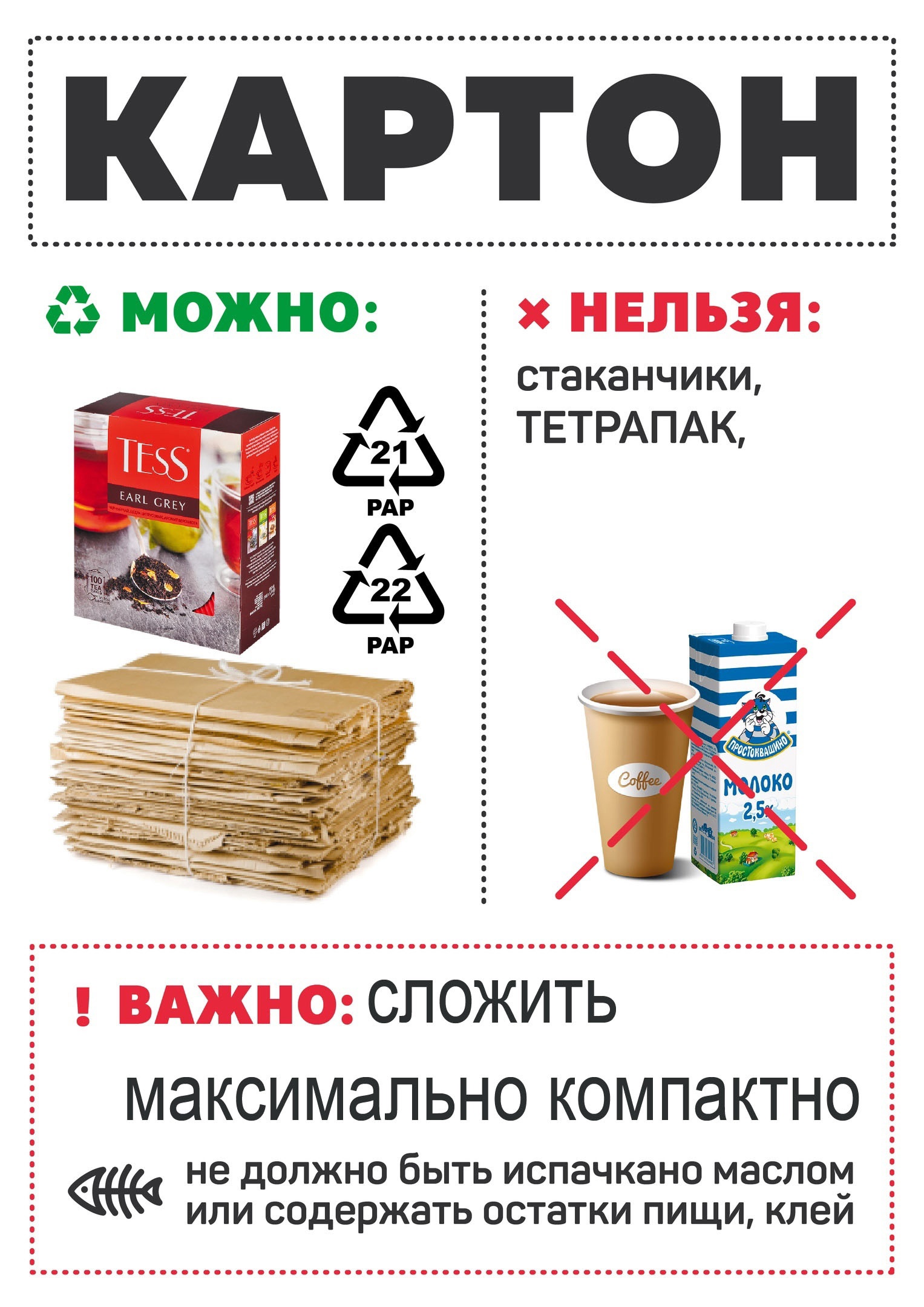 Бумага, картон должны быть чистыми (без пищевых следов) плотно сложены и упакованы.