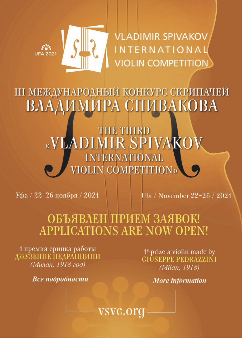 С 22 по 27 ноября в Республике Башкортостан пройдет III Международный конкурс скрипачей Владимира Спивакова. На конкурс было подано более 300 заявок из 12 стран мира. По решению международного жюри на 1 тур конкурса проходят 12 человек. Они вступят в борьбу за право обладания ценнейшими скрипками работы итальянского, французского и российского мастеров.