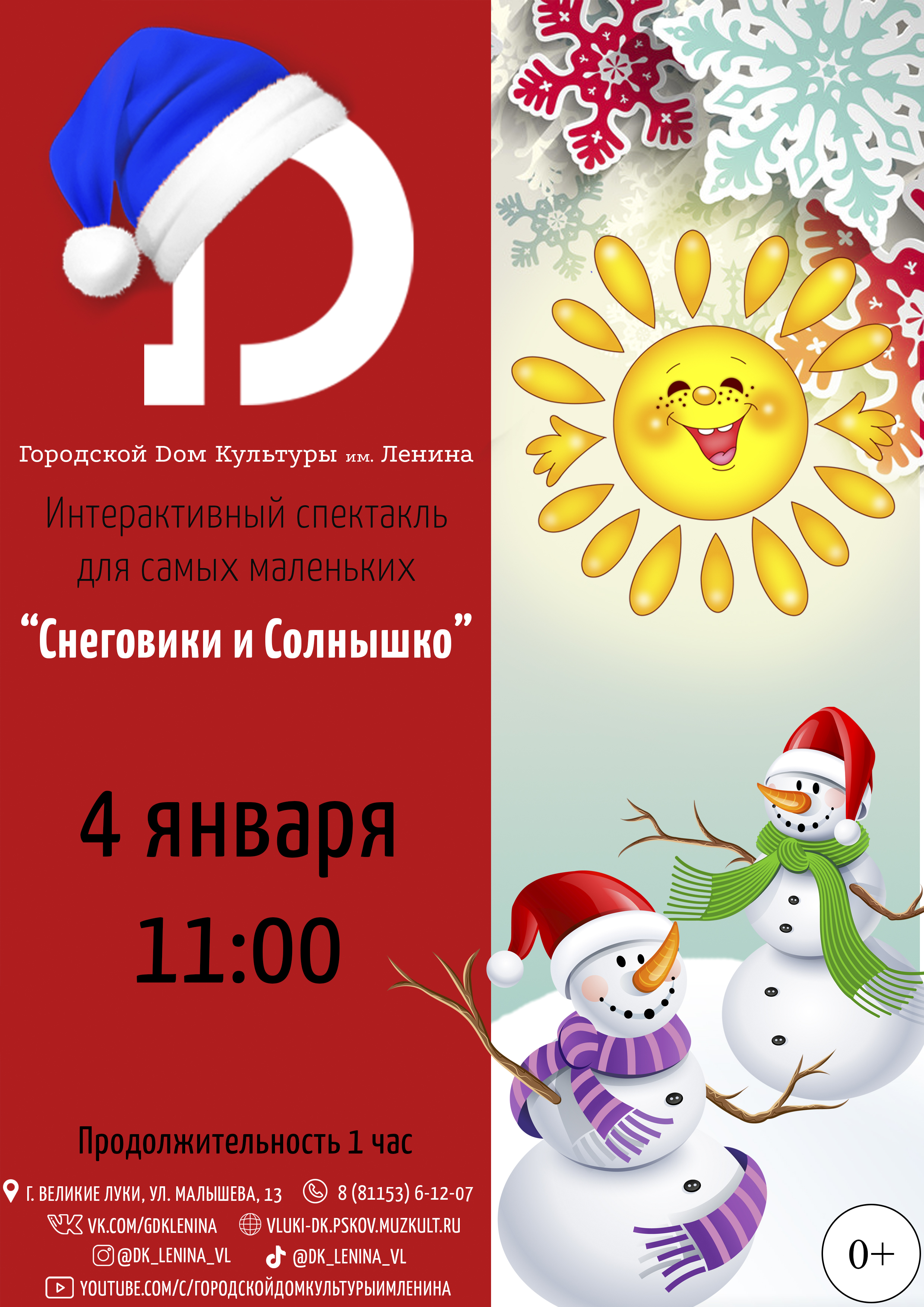 МБУК «ГДК им. Ленина» приглашает всех девчонок и мальчишек, а также их родителей на интерактивный кукольный спектакль для самых маленьких «Снеговики и солнышко»