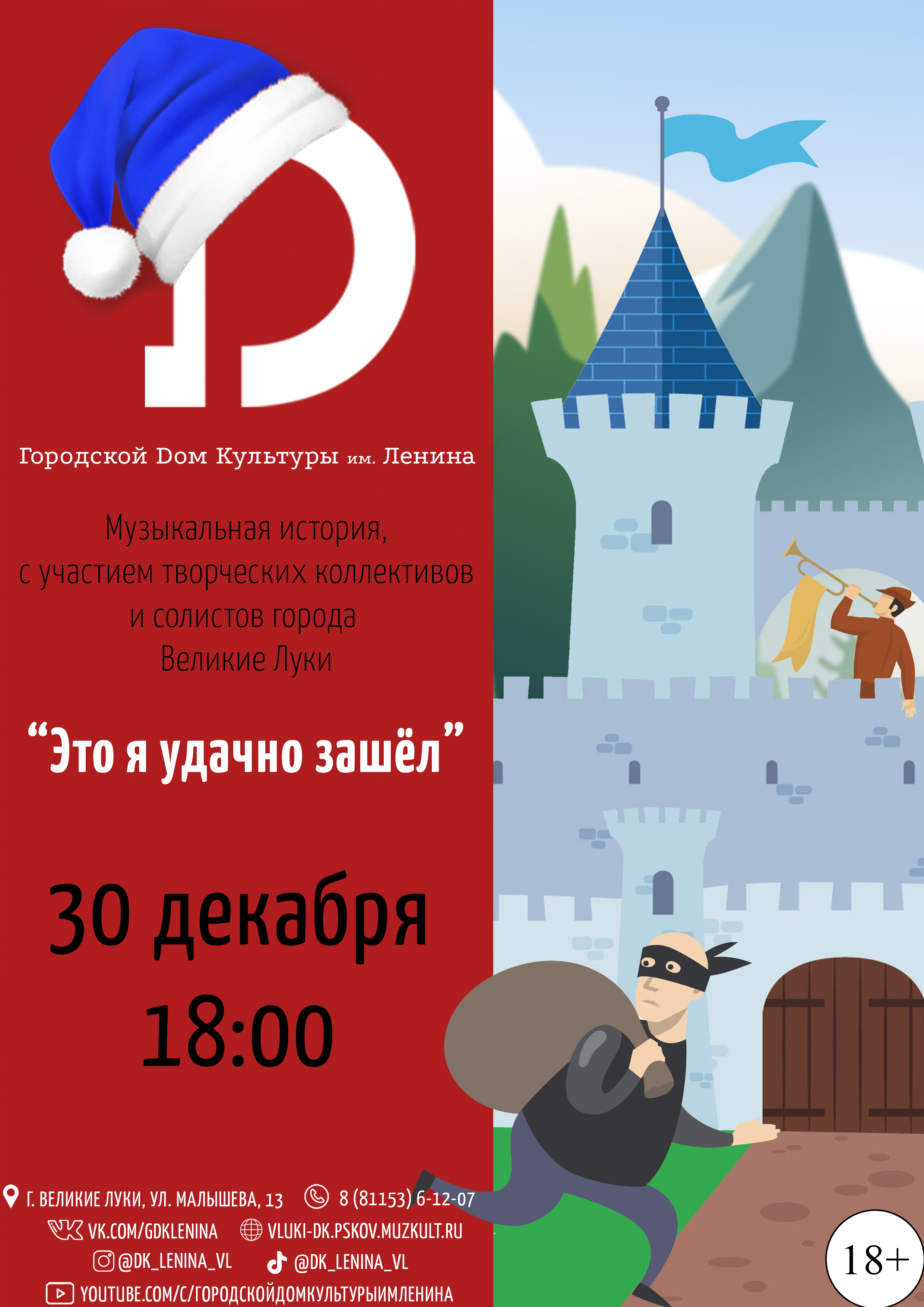Городской дом Культуры приглашает жителей и гостей города посетить новогоднюю музыкальную комедию «Это я удачно зашел». Музыкальная история окунет всех зрителей в сказочное и незабываемое путешествие и расскажет об увлекательных приключениях героев. А зажигательные хореографические номера и современные хиты, яркие костюмы и красочное световое оформление, подарят фейерверк праздничного настроения и радостных эмоций. В комедии примут участие: Народный коллектив театр танца «Мистерия», Ансамбль танца «Белые Росы» и солистка Анна Афанасьева!
