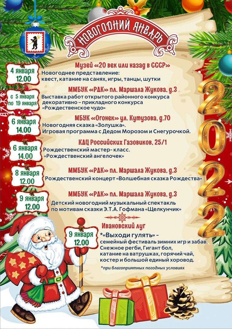 "Выходи гулять" - семейный фестиваль зимних игр и забав. В программе мероприятий : Снежное регби, Гигант бол, катание на ватрушках, горячий чай, костер и большой единый хоровод. мероприятие проходи на Ивановском лугу. Начало 9 января 2022года в 12.00