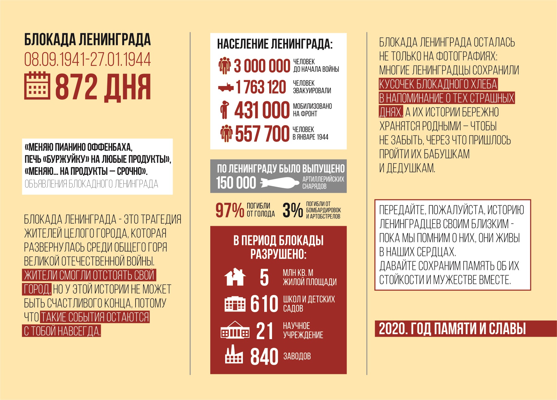27 января 2022 года исполняется 78 лет со дня снятия блокады Ленинграда. В этот день на территории города пройдет Всероссийская акция памяти «Блокадный хлеб». Акция призвана напомнить о мужестве жителей Ленинграда, переживших беспрецедентную блокаду миллионного города вражескими захватчиками.