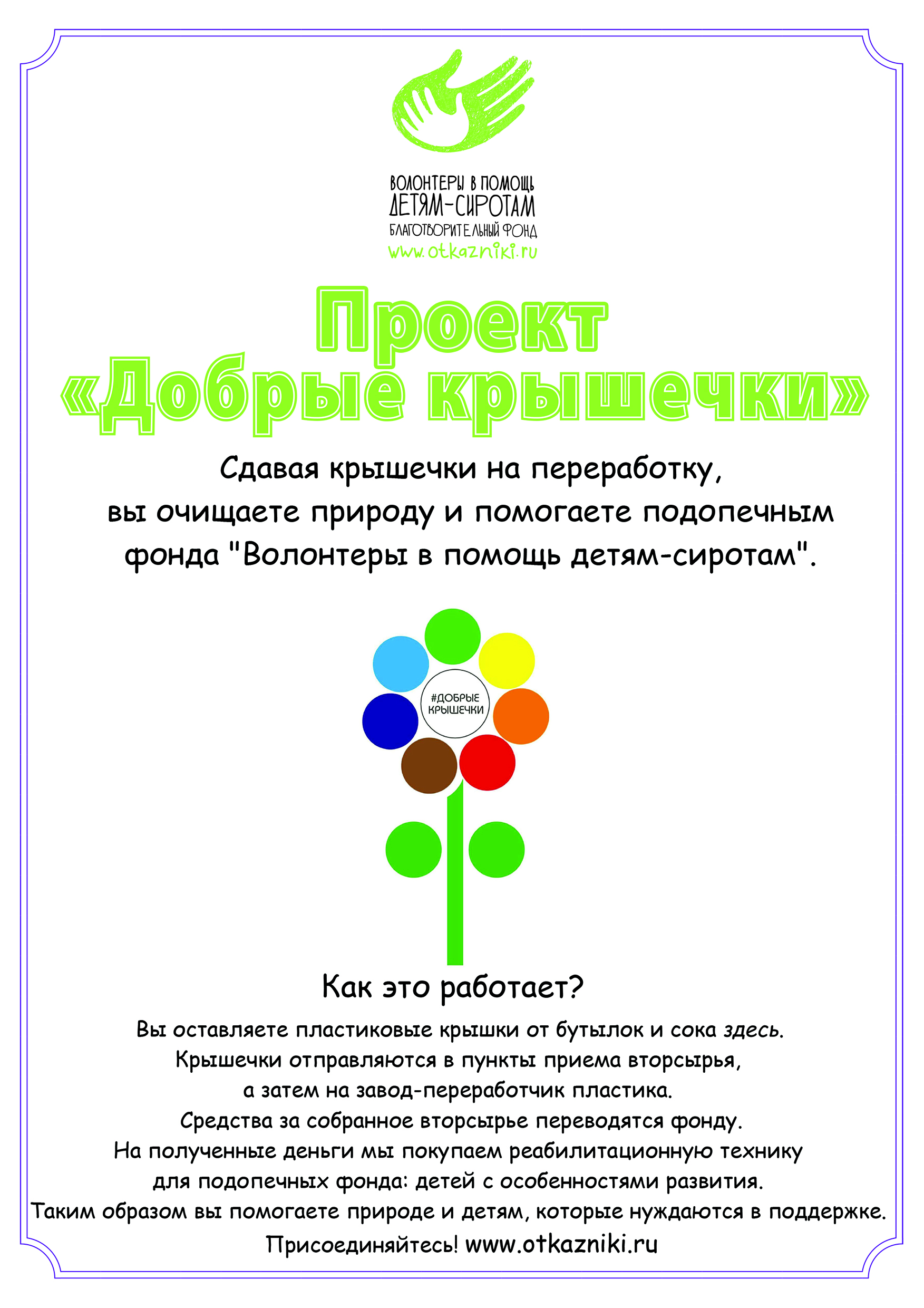 Это проект по сбору пластиковых крышечек определённых видов для покупки реабилитационной техники детям с ОВЗ из приёмных семей – подопечным фонда Фонд "Волонтеры в помощь детям-сиротам" из разных регионов.
