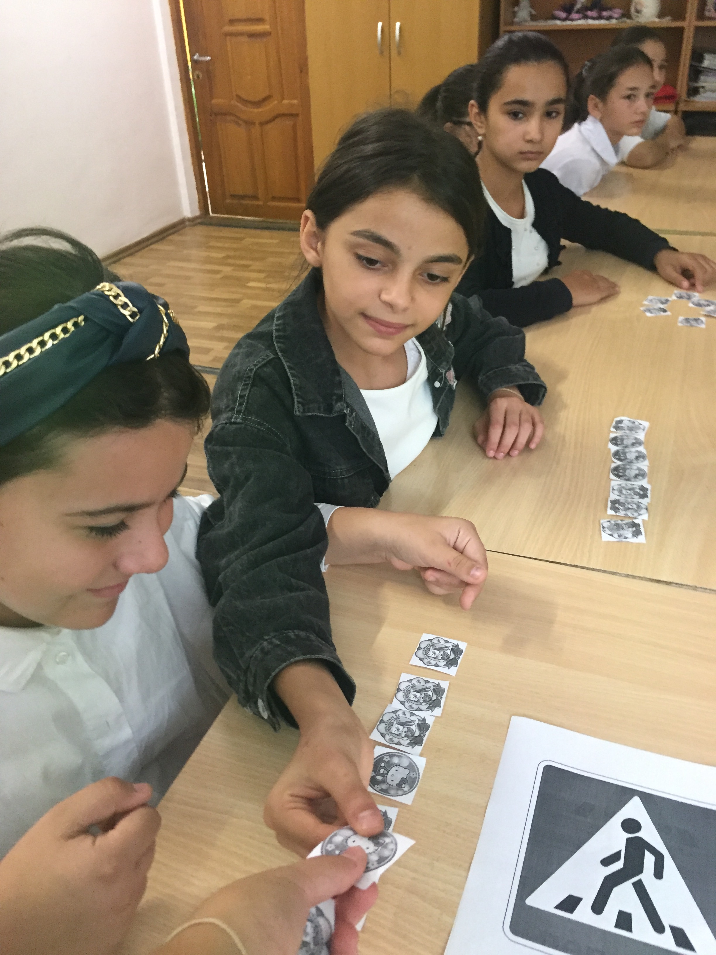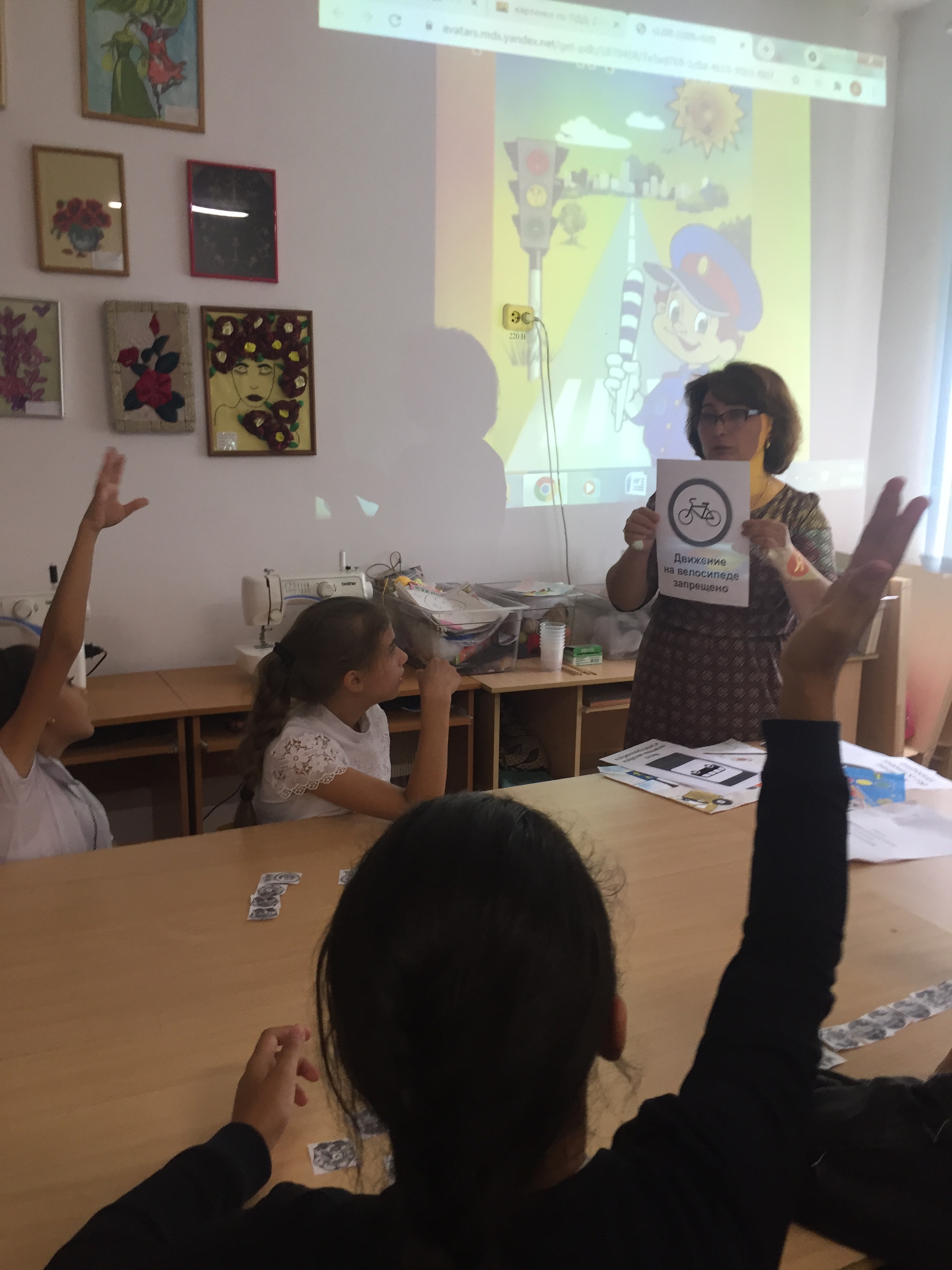 На занятии предлагает увлекательные театрализованные занятия, знакомящие младших школьников с правилами и знаками дорожного движения для пешеходов, велосипедистов, любителей катания на роликах и скейтбордах.