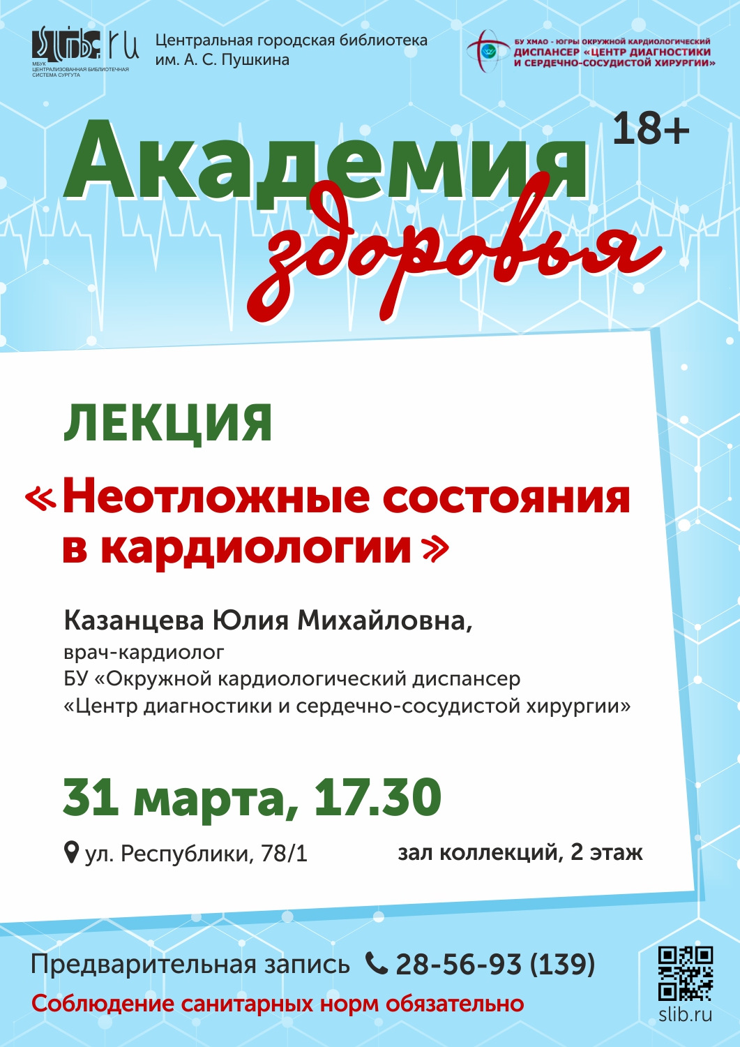 "Академия здоровья" - цикл лекций, который ежемесячно проводится в Центральной городской библиотеке им. А. С. Пушкина в рамках проекта "Сургут - сердечный город" от БУ «Окружной кардиологический диспансер «Центр диагностики и сердечно-сосудистой хирургии». Лекции отличаются доступностью изложения, сопровождаются презентациями, материал готовят и читают врачи-кардиологи с целью профилактики сердечно-сосудистых заболеваний и информационной поддержки пациентов, которым требуется лечение или реабилитация. Мероприятие открыто для всех желающих и проводится бесплатно, есть возможность задать вопросы лектору.