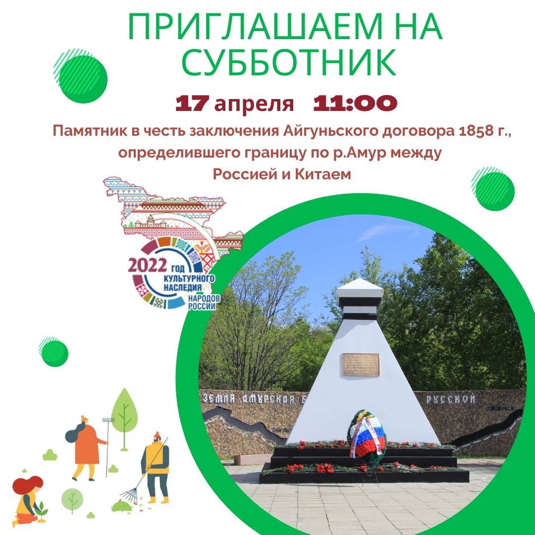 17 апреля в 11:00 в рамках телемарафона «Наследие» состоится субботник на памятнике, в честь заключения Айгуньского договора 1858 г., определившего границу по р. Амур между Россией и Китаем, приуроченный к Международному дню охраны памятников и исторических мест и Году культурного наследия народов России. Трансляция мероприятия пройдет в прямом эфире Амурского областного телевидения https://amurobl.tv/news/kultura/2022-04-06-amurskoe-nasledie-telemarafon-o-tom-chto-dorogo-kazhdomu-amurchaninu
