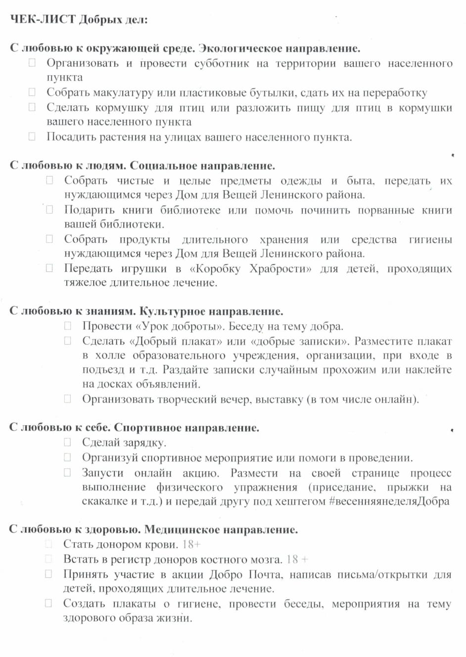 в период с 18.04.2022 г. по 24.04.2022 г. сделать минимум 5 добрых дел из Чек-Листа (см. ниже) по одному из каждого из направлений (исключение для несовершеннолетних участников, которые могут не выполнять доброе дело из медицинского направления, заменив из другого направления).