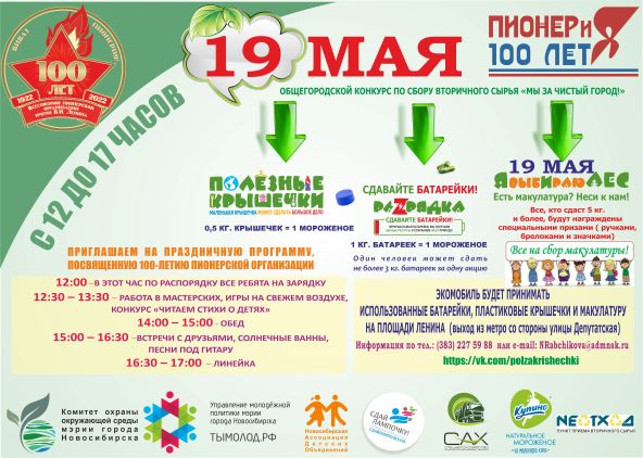 19 мая С 12 ДО 17 ЧАСОВ все желающие жители Новосибирска будут сдавать макулатуру, пластиковые крышечки и использованные батарейки.
