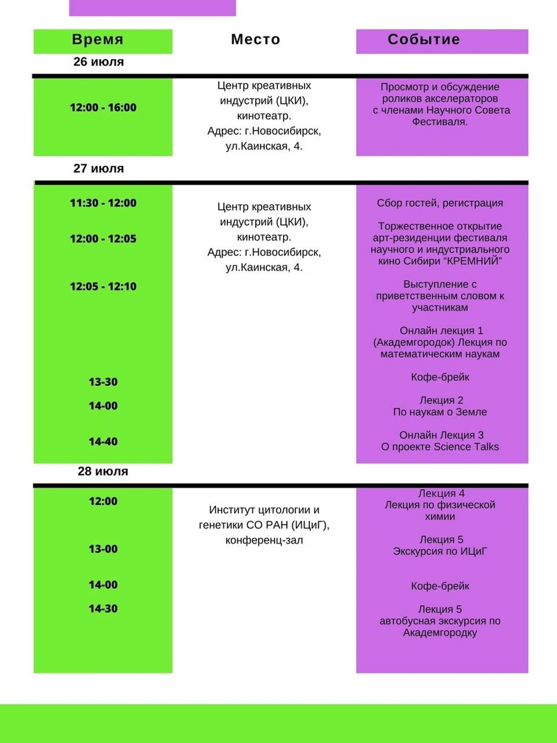 С 25 по 31 июля в рамках Фестиваля научного и индустриального кино Сибири «КРЕМНИЙ» пройдёт Арт-сайнс резиденция - серия событий, где вы познакомитесь с удивительным миром науки. Приглашаем заинтерисованных волонтеров. В программе: торжественное открытие арт-резиденции фестиваля, интересные лекции по наукам, экскурсии по Институту цитологии и генетики, археологии и этнографии СО РАН, Новосибирскому государственному университету, автобусная экскурсия по Академгородку. Программа прилагается. Обязательно для всех регистрация по ссылке