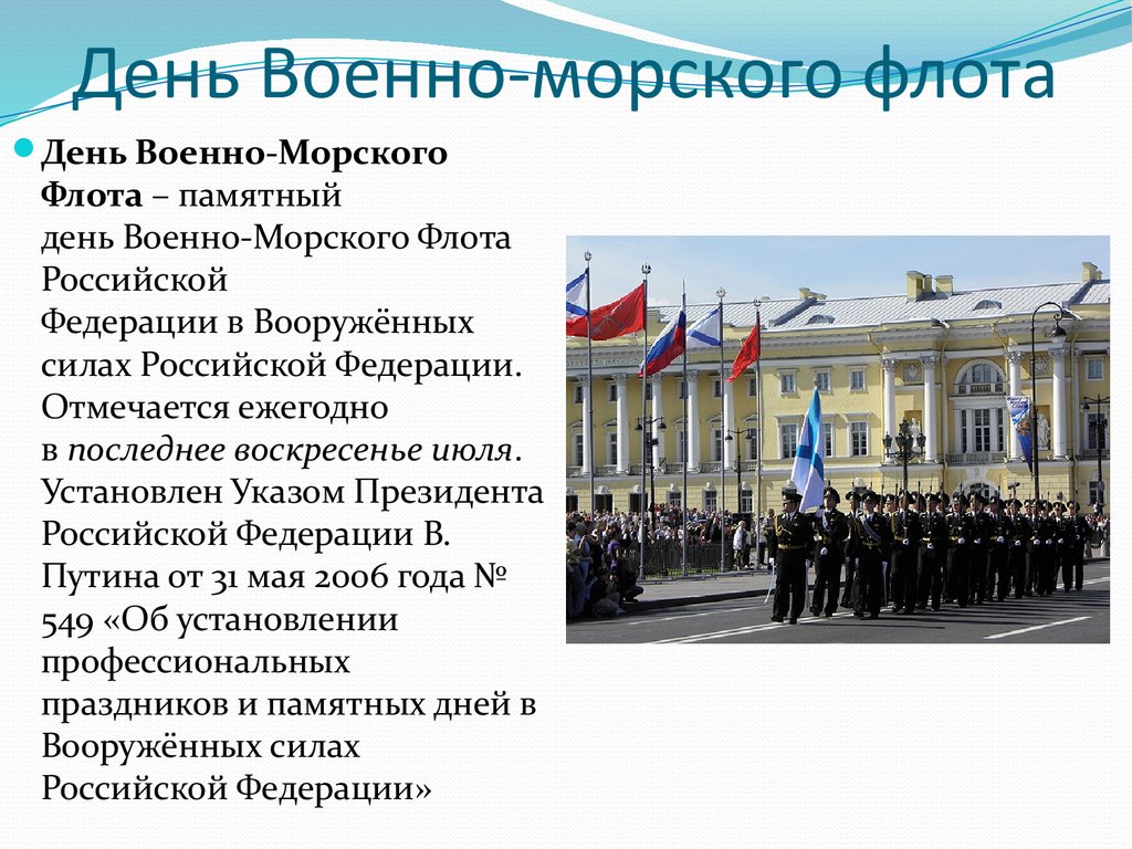 День Военно-Морского Флота Российской Федерации отмечается в последнее воскресенье июля на основании Указа Президента РФ от 31 мая 2006 года № 549 «Об установлении профессиональных праздников и памятных дней в Вооружённых силах Российской Федерации».