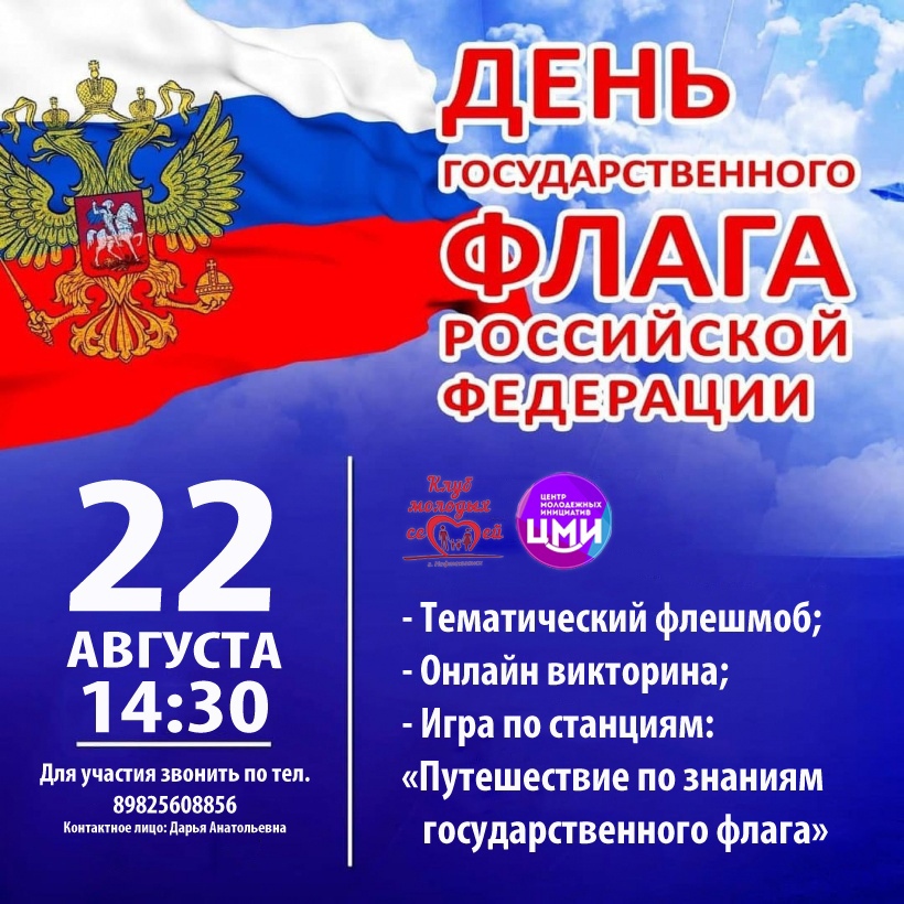 Мероприятие, посвященное дню Государственного Флага РФ. В честь праздника будет проводиться танцевальный флешмоб, онлайн викторина, а также викторина "Путешествие по знаниям Государственного Флага, где команды будут на скорость проходить 5 станций