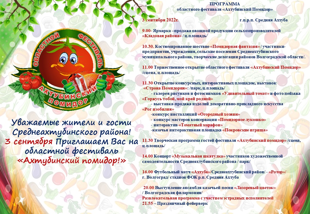 10 сентября 2022 года на территории городского поселения рабочего поселка Средняя Ахтуба, Среднеахтубинского муниципального района состоится областной фестиваль "Ахтубинский помидор", который по праву считается брендом района.
