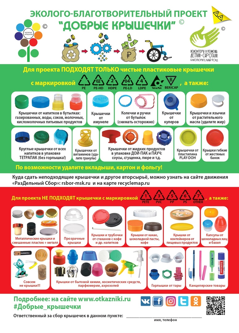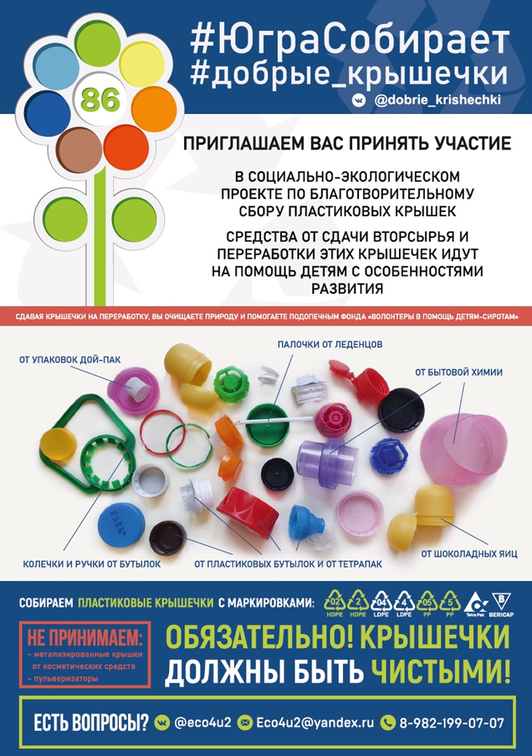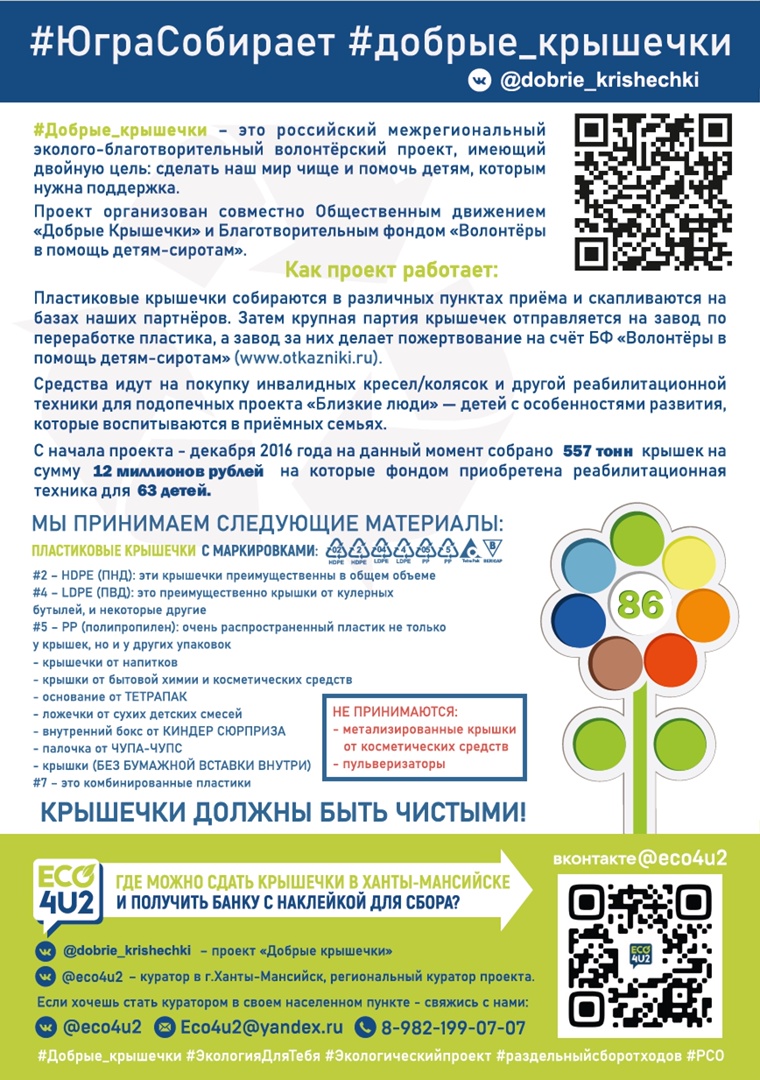 В рамках XIX Международной экологической акции "Спасти и сохранить" присоединяемся к российскому эколого-благотворительному волонтерскому проекту по сбору пластиковых крышечек для покупки инвалидных колясок и другой реабилитационной техники детям с ОВЗ. Проект организован совместно с Общественным движением "Добрые крышечки" и Благотворительным фондом "Волонтеры в помощь детям-сиротам". Каждый югорчанин может собрать и сдать пластиковые крышечки в пункты приема в своем муниципальном образовании.