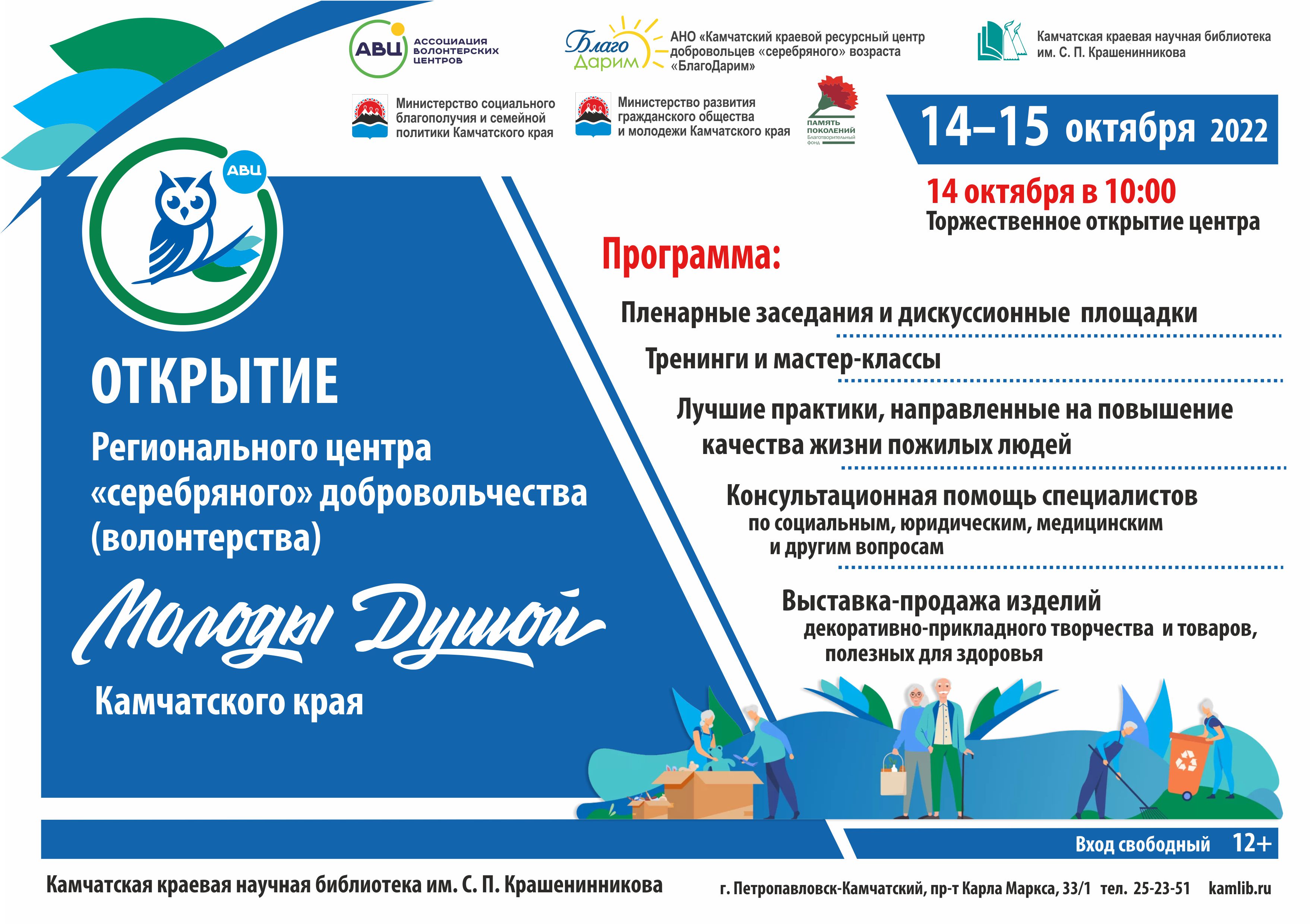 добровольчества. Мероприятия, посвященные открытию Центра, пройдут в Камчатской краевой научной библиотеке им. С. П. Крашенинникова 14 и 15 октября. Торжественная церемония начнется 14 октября в 10:00.