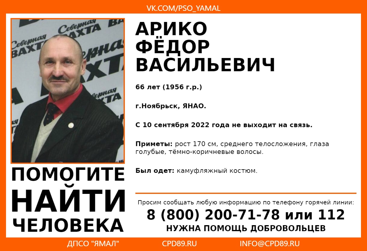 Просим сообщать любую информацию о местонахождении пропавшего по телефону горячей линии ДПСО «ЯМАЛ» 8-800-200-71-78 или 112.