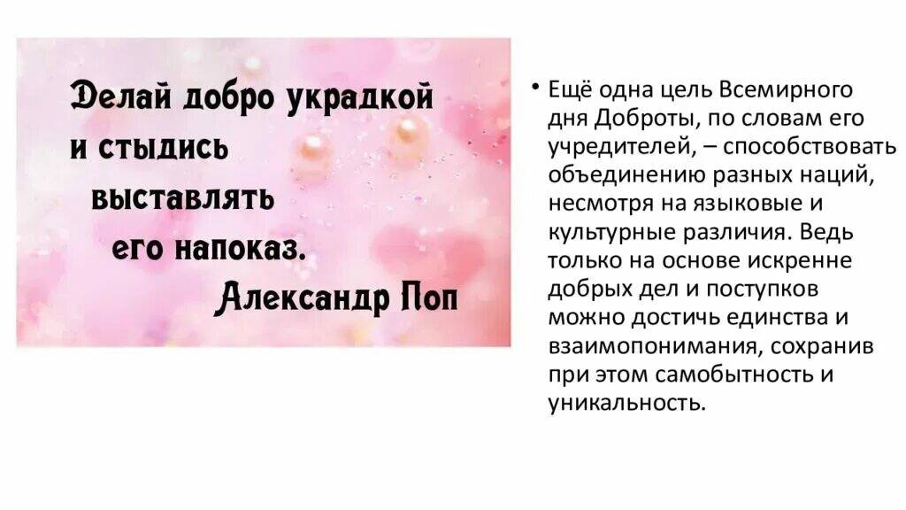 Проводить Всемирный день Доброты предложили участники организации, созданной в Японии в 1997 году и объединившей добровольцев из разных стран. Она называется «Всемирное движение доброты». Ее участники стремятся сделать мир гуманнее, совершая благородные поступки. Официально праздник был учрежден 18 ноября 2000 года на 3 конференции Движения в Сингапуре. Волонтерский отряд " Добро" призывает молодежь принять участие в празднике. В день доброты принято дарить цветы встречным людям. Призываем молодежь выйти на улицу и дарить цветы всем прохожим. Этим поднять настроение людям.