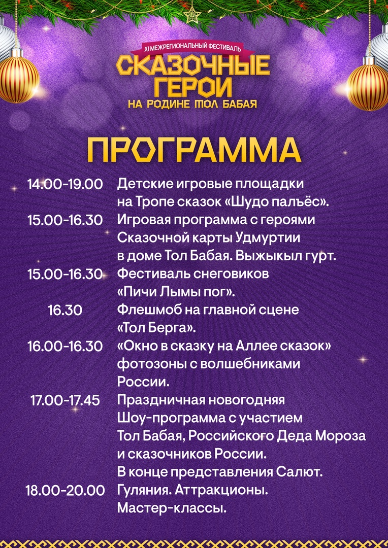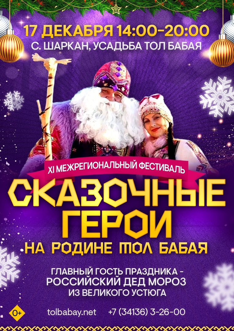 Настоящая зимняя сказка! Новогоднее настроение подарит самый яркий праздник зимы - Фестиваль сказочных героев на родине Тол Бабая! Фестиваль состоится 11 декабря. Яркое театрализованное представление с участием Российского Деда Мороза, Тол Бабая и сказочных героев из разных регионов России.
