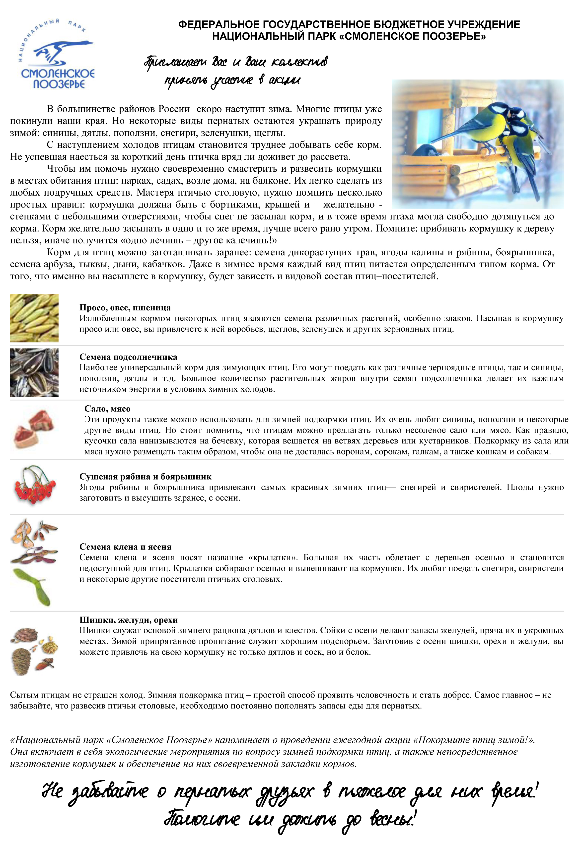 Акция включает в себя проведение экологических занятий о необходимости зимней подкормки птиц, а также непосредственно изготовление кормушек и обеспечение своевременной закладки кормов.