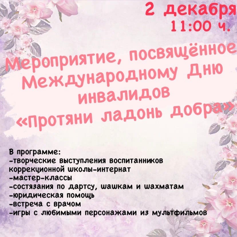 2 дкабря в с. Новобелокатай пройдет тематическая программа, посвящённая дню инвалида под названием «Протяни ладонь добра». Волонтерыпроведут творческий мастер-класс и игры.