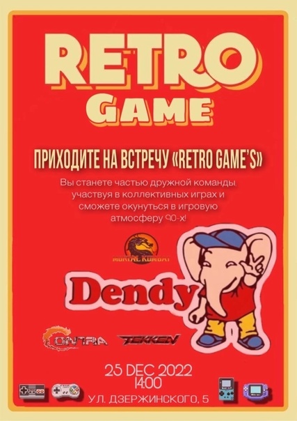 Тогда приходите на встречу «Retro game’s» в воскресенье 25 декабря в 14:00 в Дом молодёжи (Дзержинского, 5), и стань частью дружной команды, участвуя в коллективных играх и окунувшись в игровую атмосферу 90-х!