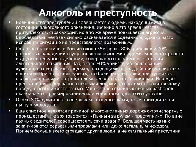 Преступления, совершенные в состоянии алкогольного опьянения, как правило, происходят по схожей схеме. Между родственниками или знакомыми в процессе совместного распития спиртных напитков возникают ссоры, которые заканчиваются причинением тяжкого вреда здоровью. Кроме этого нетрезвые люди на улицах очень часто становятся жертвами преступлений. Злоумышленники пользуются состоянием граждан, рассчитывая на то, что они не всегда могут оказать сопротивление, а зачастую и вспомнить примет нападавших. Профилактика «пьяной» преступности носит комплексный характер и включает в себя индивидуальную работу с лицами, входящими в группу риска, выявление административных правонарушений в ходе обеспечения порядка в общественных местах и принятие мер социального характера на уровне органов исполнительной власти.