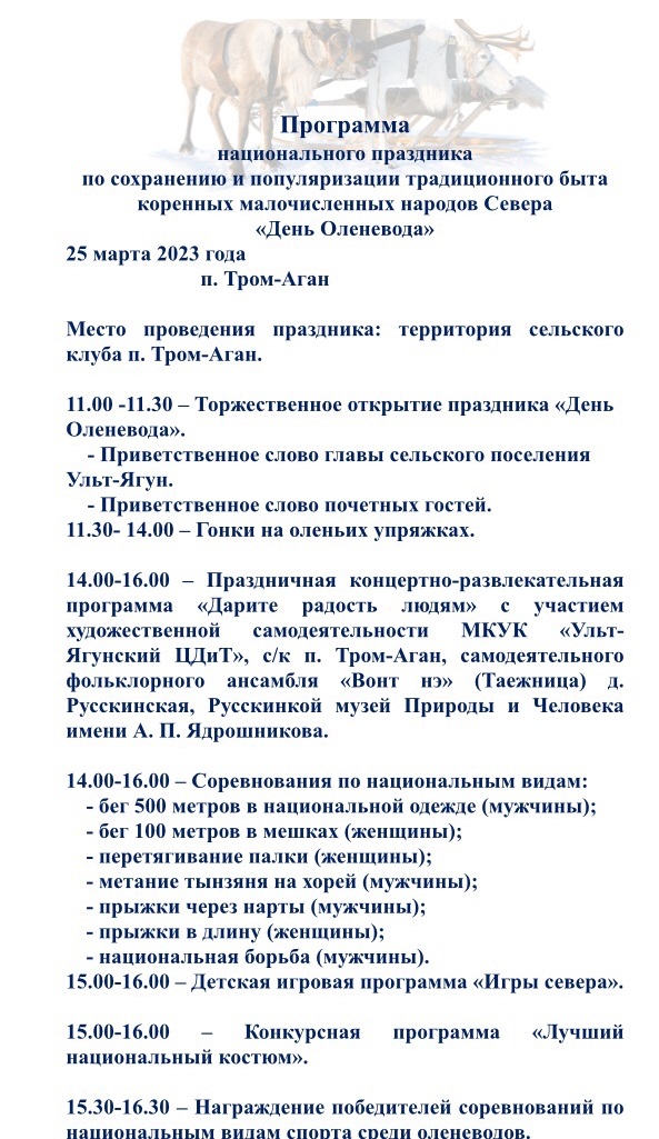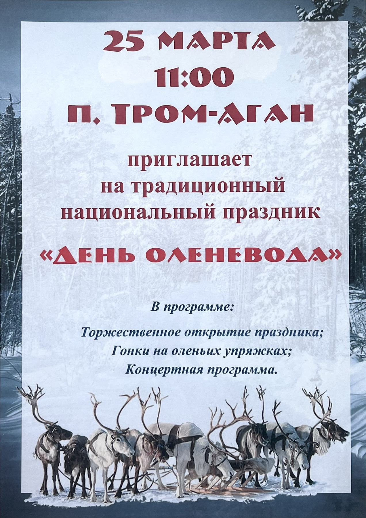 25 марта 2023 года в п.Тром-Аган состоится масштабный праздник коренных народов Севера – ханты – День оленеводов, охотников и рыбаков. Праздничные действия развернутся на площади Сельского клуба, где пройдут соревнования по национальным видам спорта – метание тынзяна на хорей, прыжки через нарты, бег на 100 и 500 метров, прыжки в мешках, перетягивание палки, национальная борьба на поясах. Будут организованы конкурсы на лучший национальный костюм в нескольких номинациях и на лучшую оленью упряжку. Самым главным и ожидаемым событием станут гонки на оленьих упряжках. На площади Сельского клуба пройдет праздничная концертная программа "Дарите радость людям!" с участием творческих коллективов Ульт-Ягунского центра досуга и творчества, Сельского клуба п.Тром-Аган и приглашенных артистов. Для детей будет организована детская игровая программа "Игры Севера".