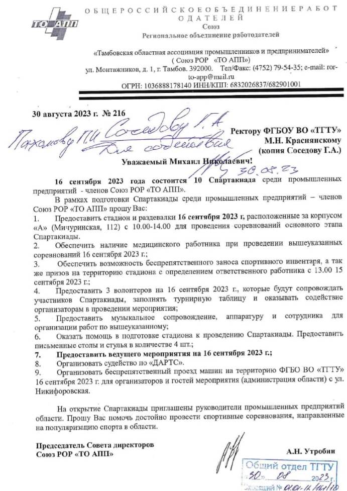 16 сентября 2023 года на стадионе Тамбовского государственного технического университета состоится X Спартакиада среди промышленных предприятий - членов Союз РОР «ТО АПП».