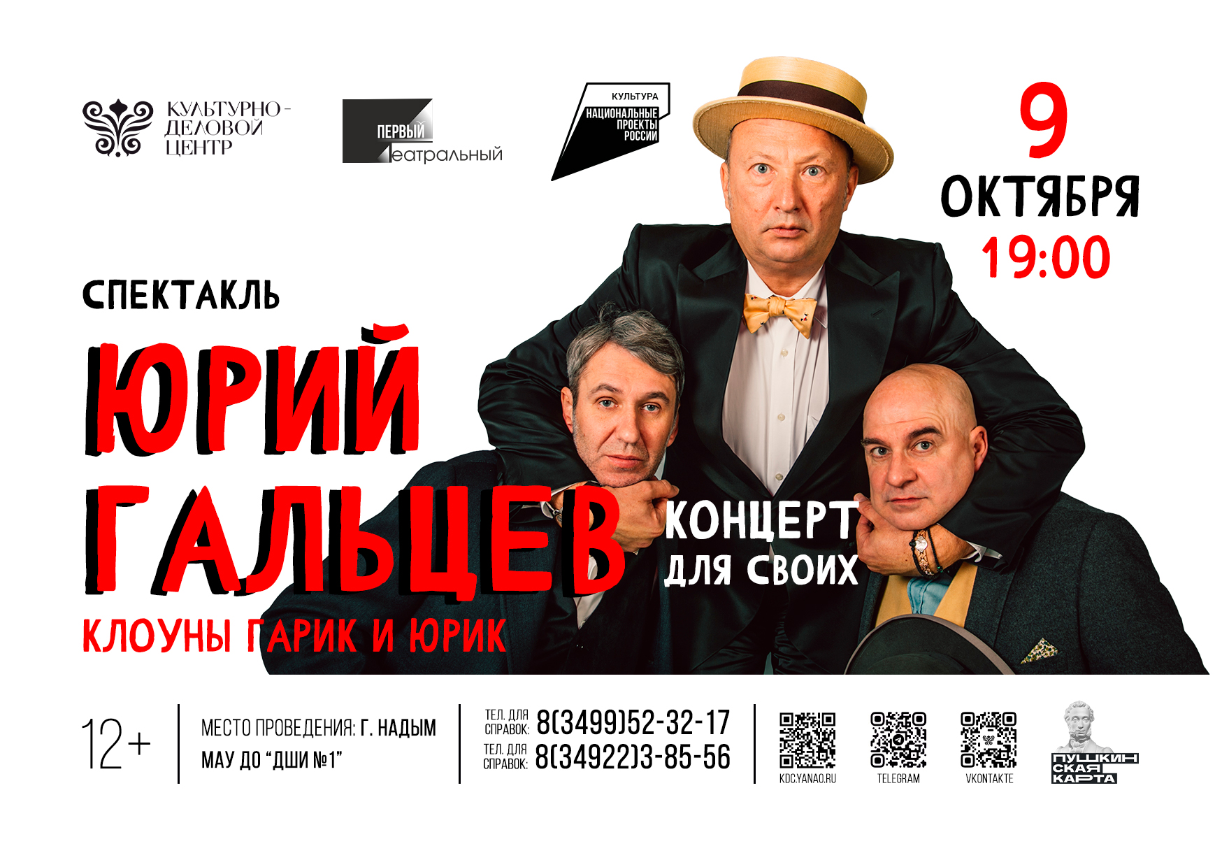 В рамках Фестиваля театрального искусства: «Первый Театральный» 09 октября 2023 года в 19 часов 00 минут на сцене МАУ ДО «ДШИ №1 города Надыма» состоится спектакль заслуженного артиста России, художественного руководителя «Театра Эстрады имени Аркадия Райкина» Юрия Николаевича Гальцева.