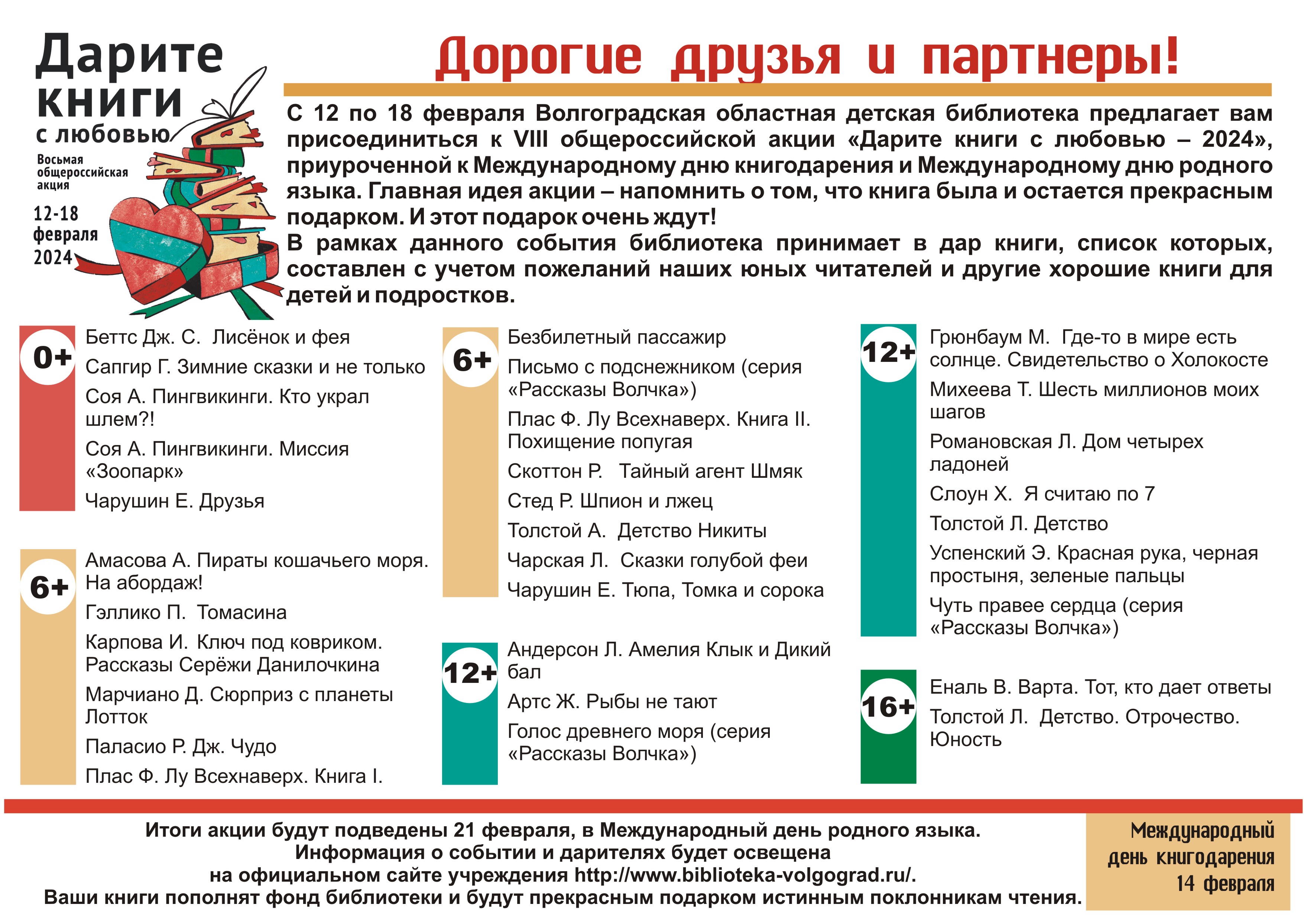 В рамках Международного дня дарения книг Волгоградская областная детская библиотека приглашает присоединиться к общероссийской акции «Дарите книги с любовью!», которая ежегодно проходит с 7 по 14 февраля.