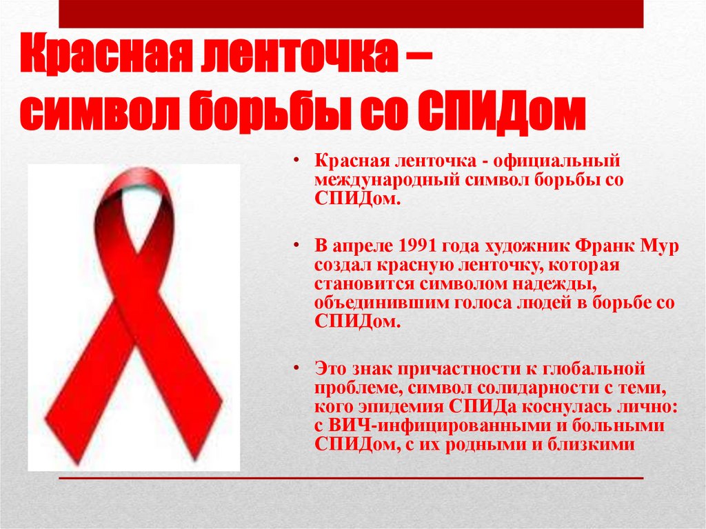 Красная лента - это символ понимания проблемы СПИДа - это символ солидарности с теми, кого эпидемия СПИДа затронула лично: с людьми, живущими с ВИЧ-инфекцией и СПИДом, с их близкими, родными и друзьями.