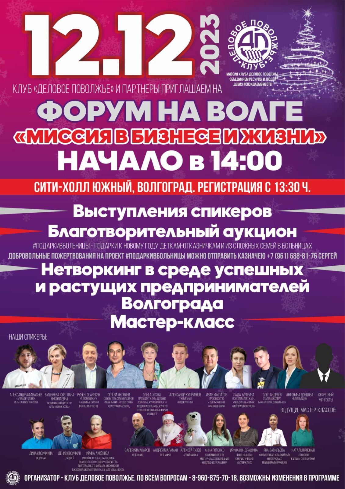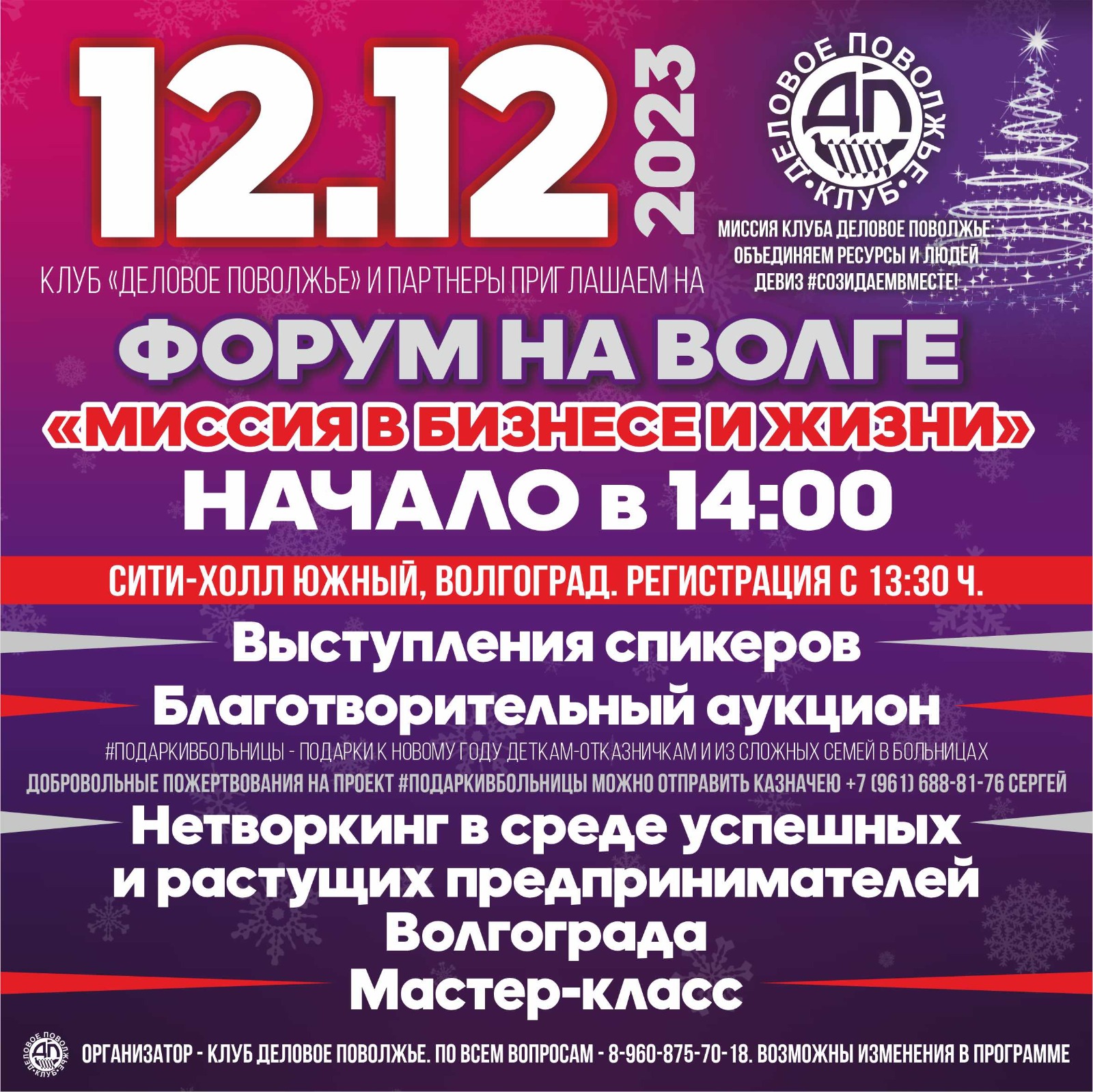 12 декабря в Волгограде состоится мероприятие - Форум на Волге "Миссия в бизнесе и жизни". Организатор - Клуб "Деловое Поволжье", Ольга Козак 89608757018