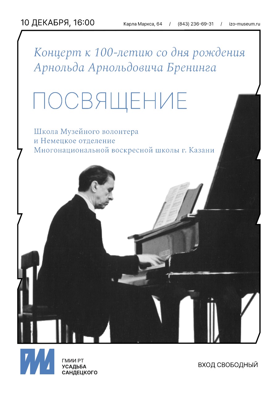 10 декабря в 16.00 воспитанники Школы музейного волонтера и ученики немецкого отделения Многонациональной воскресной школы г. Казани приглашают вас на концерт ПОСВЯЩЕНИЕ. К 100-ЛЕТИЮ СО ДНЯ РОЖДЕНИЯ АРНОЛЬДА АРНОЛЬДОВИЧА БРЕНИНГА.