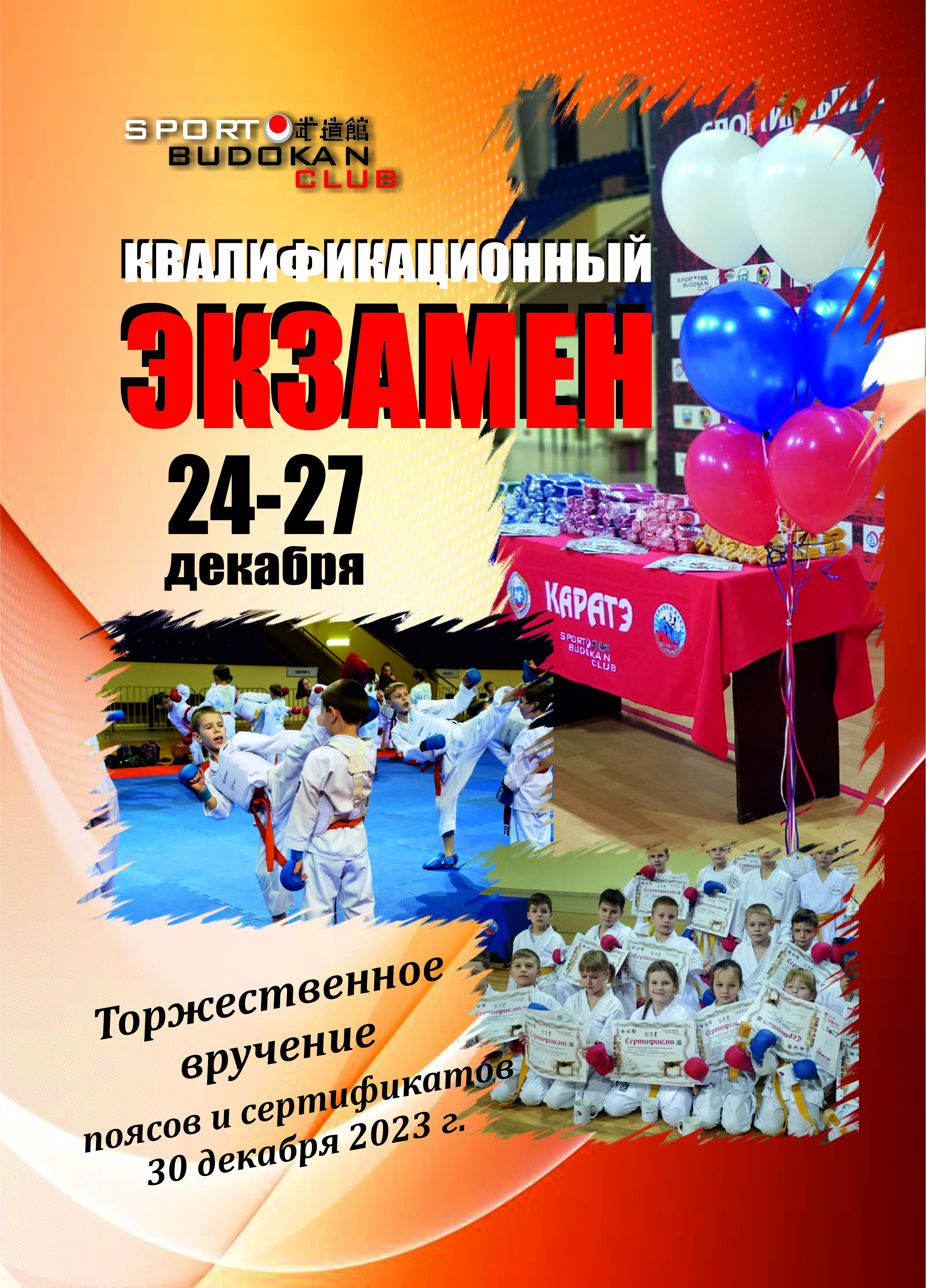 Торжественное вручение сертификатов и поясов спортсменам, сдавшим успешно экзамен, а также благодарственных писем за спортивные результаты по итогам 2023 года. Волонтеры контролируют и выводят детей на награждение.