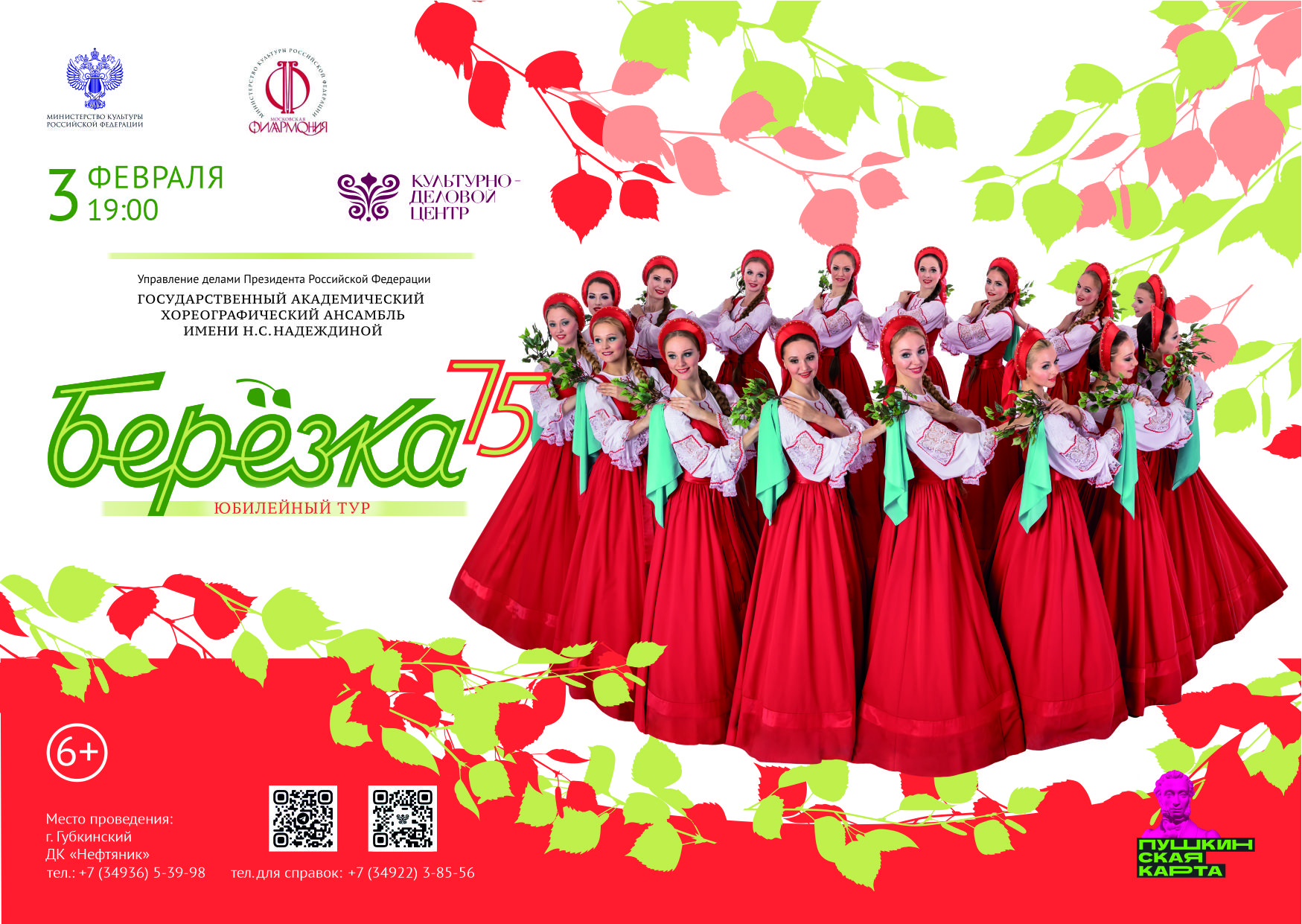 В рамках юбилейного тура 03 февраля 2024 года в 19 часов 00 минут на сцене Дворца культуры «Нефтяник» муниципального бюджетного учреждения Централизованная клубная система города Губкинского состоится концерт государственного академического хореографического ансамбля «Березка» имени Н.С. Надеждиной.