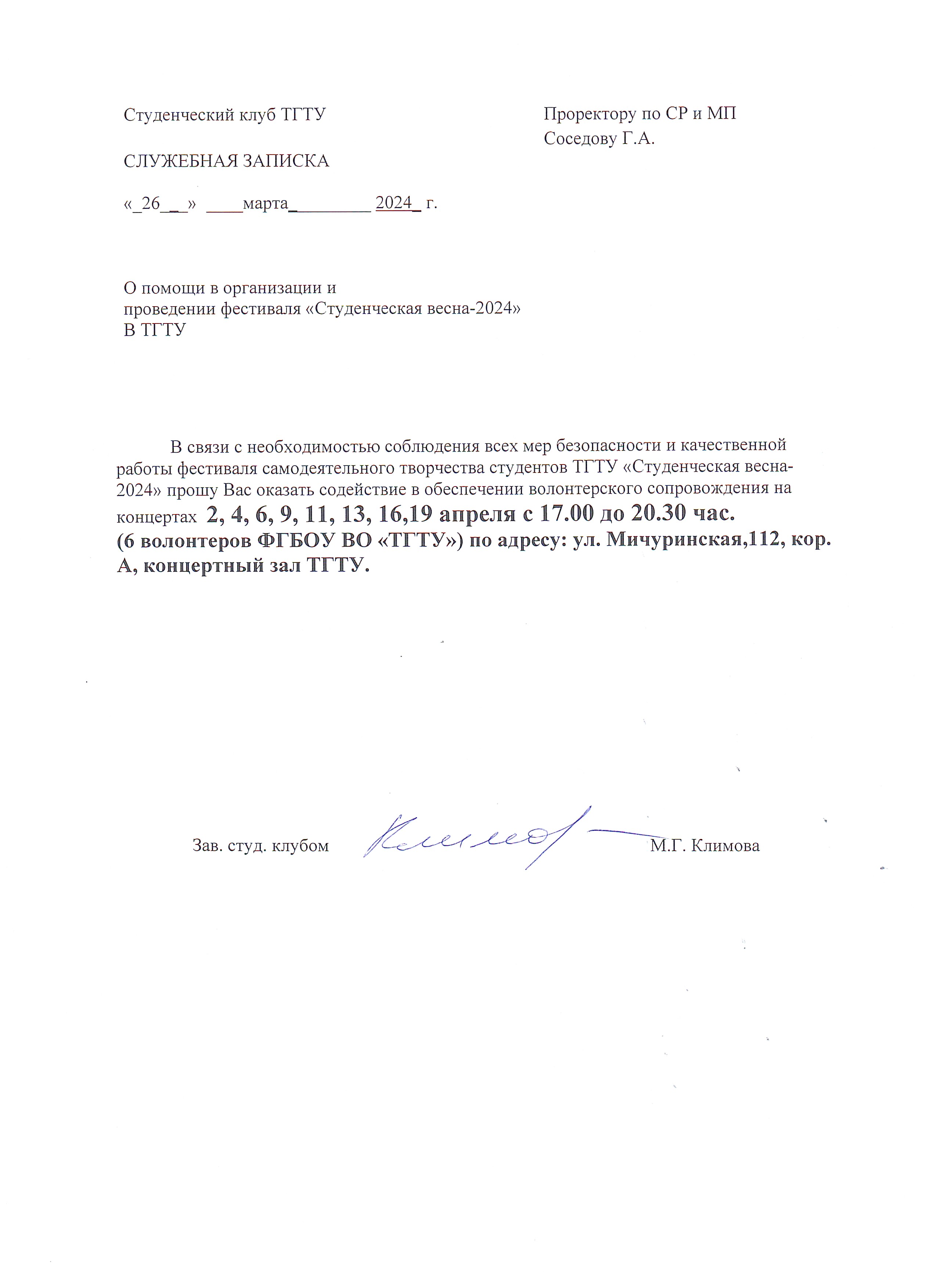 Помощь в организации Фестиваля самодеятельного творчества Студенческая весна 2024" студентов Института экономики и качества жизни в Тамбовском государственном техническом университете