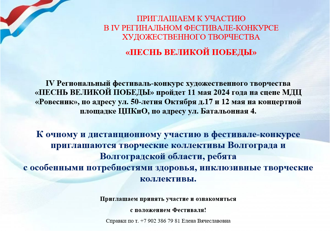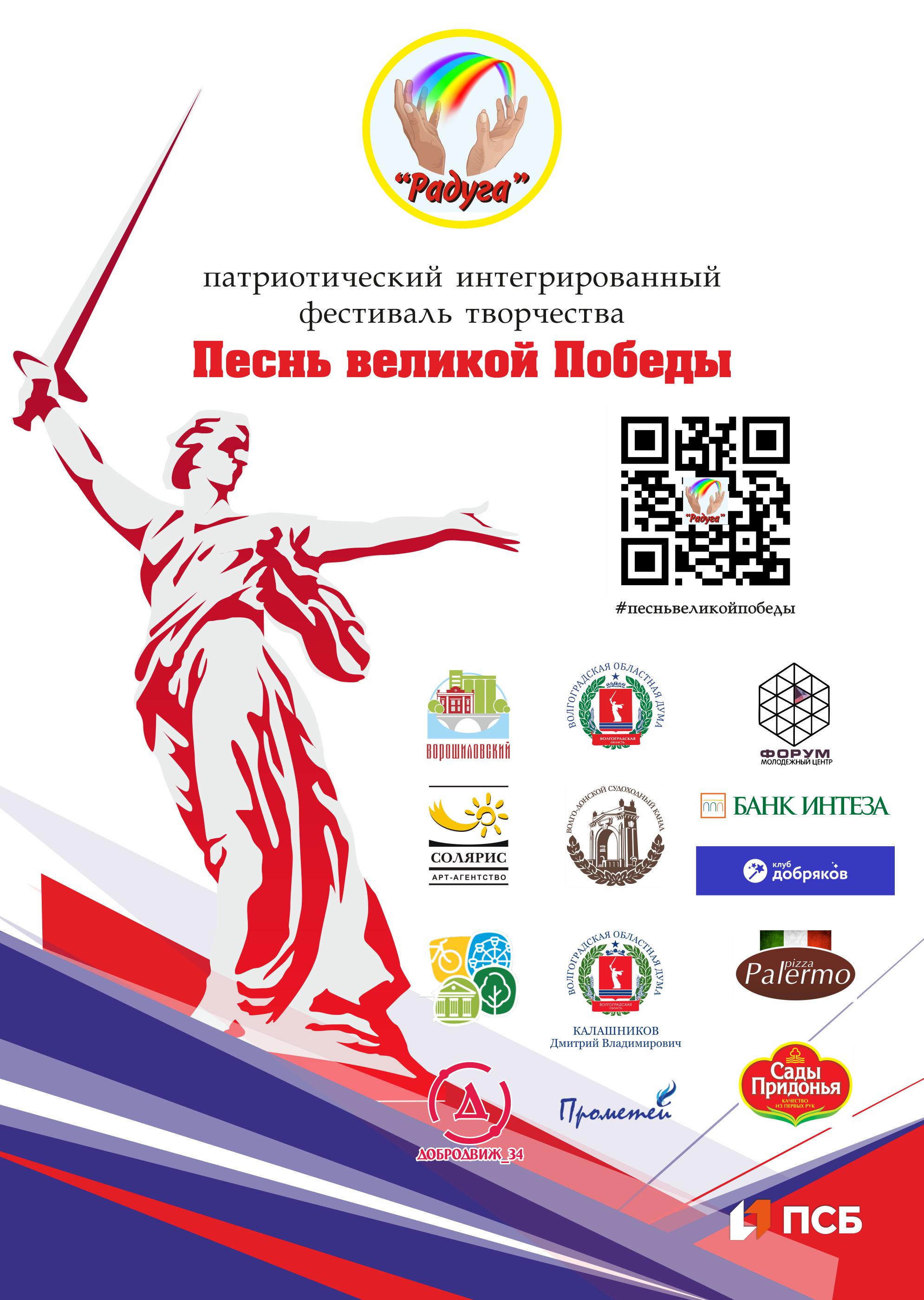 11 мая в МДЦ «Ровесник» Красноармейского района Волгограда и 12 мая 2023г. На сцене парка ЦПКиО состоится патриотический интегрированный фестиваль «Песнь великой Победы» с участием творческих детско- юношеских коллективов Волгограда и ребят с ограниченными возможностями здоровья, воспитанников реабилитационных центров и участников инклюзивных творческих коллективов Волгограда. посвященный Дню Победы.